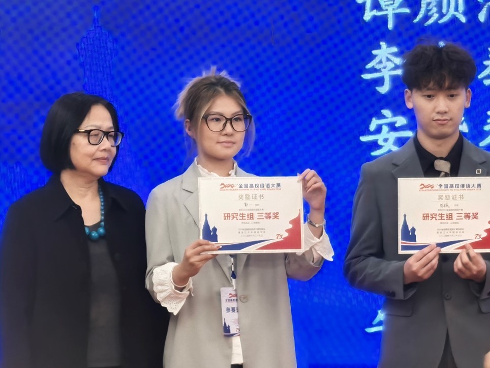 2024年10月26日至27日,第十七届全国高校俄语大赛的复赛与决赛在哈尔滨市伏尔加庄园举行。本次大赛由教育部国际合作与交流司主办,黑龙江大学承办。开云官方网页版俄语系本科生马卓仪(2023级)、苏传顺(2021级)与硕士研究生郭一(2023级)参加此次 比赛。马卓仪获低年级组二等奖,苏传顺获高年级组三等奖,郭一获研究生组三等奖。