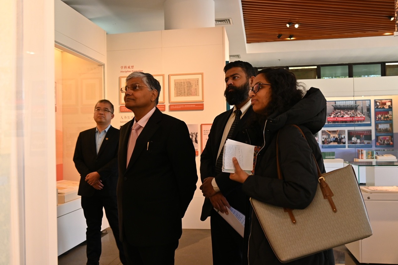 会见后,罗国栋一行移步至北京大学校史馆,在北京大学档案馆、校史馆馆长余浚陪同下,参观“百年回眸:北大的印度学学科建设与中印人文交流展”,开云官方网页版南亚学系博士生郭家誉为嘉宾详细导览。展览通过珍贵文献、历史照片及学术成果,系统梳理了北京大学印度学学科百年发展历程,展示了历代北大学者在印度宗教、哲学、文学、图像学、语言教学等领域的丰硕成果。北大的印度学科不仅是中国早期东方学的重要组成部分,也为中国东方学学科的建设和发展树立了标杆,并将继续为新时代的印度学学科建设发挥关键作用。观展结束后,罗国栋为北京大学校史馆写下亲笔留言,并与接待嘉宾合影留念。