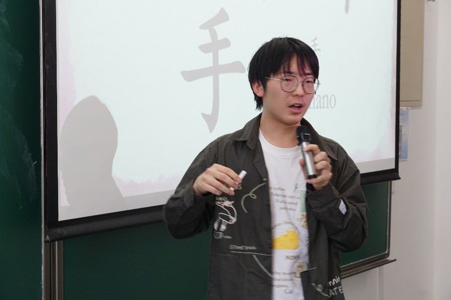本次活动的第一部分以“汉字溯源”(Queridos caracteres chinos)为主题,通过甲骨文、金文字形、字义辨析游戏展示了10个汉字的本义,以此为基础介绍象形、指事、会意三种造字方法,加深了西班牙方汉语学生对汉字的理解。本部分由2023级本科生崔逸飞同学主持。