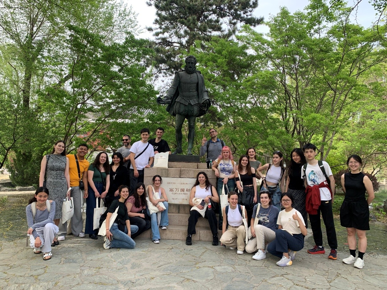 中、西学生在塞万提斯像前合影