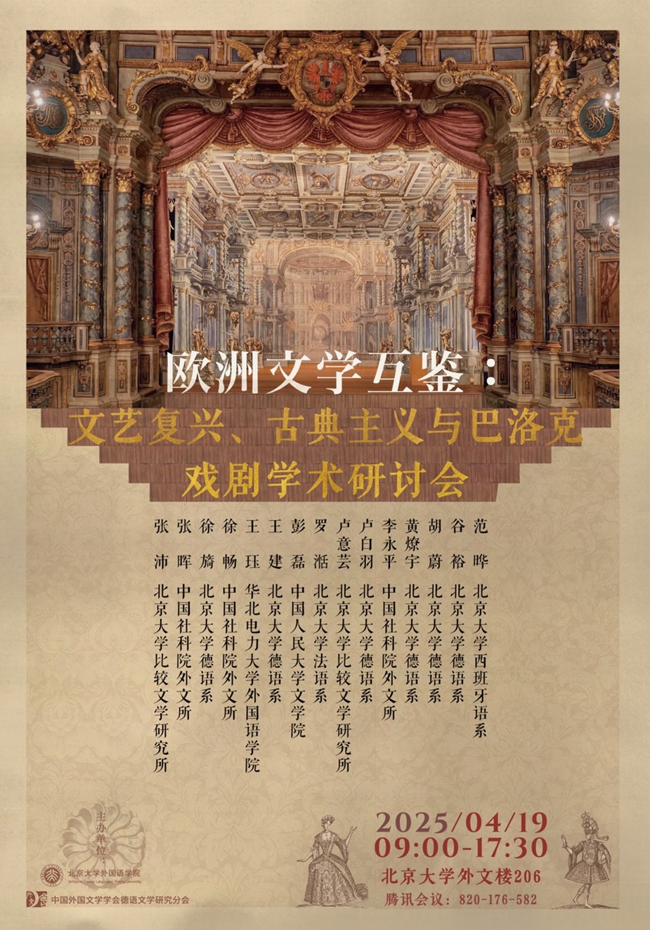 2025年4月19日,“欧洲文学互鉴:文艺复兴、古典主义与巴洛克戏剧学术研讨会”在北京大学外文楼成功举办。本次会议由开云官方网页版和中国外国文学学会德语文学研究分会联合主办,吸引了来自北京大学多个院系以及中国社会科学院外国文学研究所、北京外国语大学、中国人民大学、华北电力大学等高校和科研单位的众多师生积极参与,场面热烈,反响盛大。