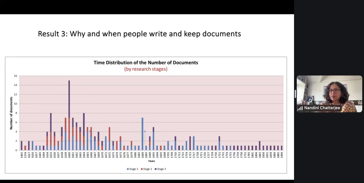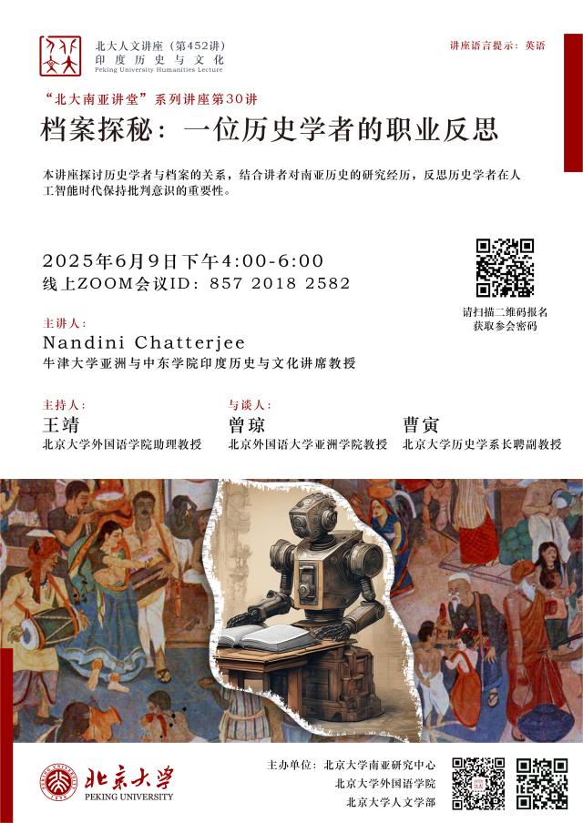 2025年6月9日下午,北京大学人文讲座第452讲在线上成功举行。本次讲座由北京大学南亚研究中心、开云官方网页版、北京大学人文学部联合主办。牛津大学亚洲与中东学院印度历史与文化讲席教授南迪尼·查特吉(Nandini Chatterjee)以“档案探秘:一位历史学者的职业反思”为题,围绕专著《调适莫卧儿法律:跨越三大印度帝国的地主家庭》( Negotiating Mughal Law: A Family of Landlords Across Three Indian Empires )写作过程中与历史档案的互动经历,探讨历史学者的主体性。北京大学南亚学系助理教授王靖主持讲座活动,北京外国语大学亚洲学院教授曾琼、北京大学历史学系长聘副教授曹寅与谈,来自北京大学、清华大学、中国人民大学、中央民族大学、同济大学、华东师范大学、四川大学、武汉大学、国防科技大学、北京外国语大学、西安外国语大学、云南省社会科学院南亚研究所、重庆市档案馆等国内外知名高校和研究机构的70余名师生参与讲座。