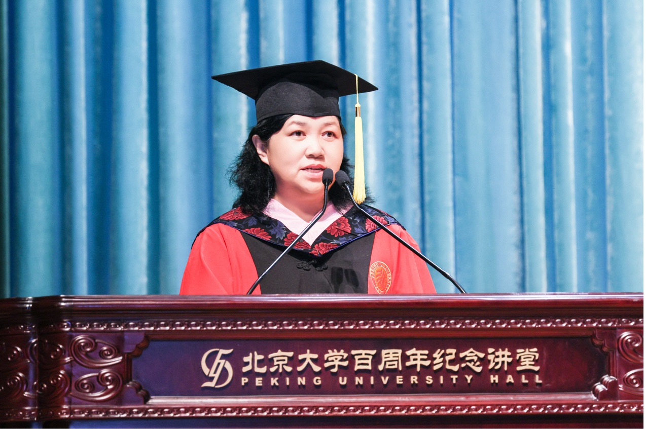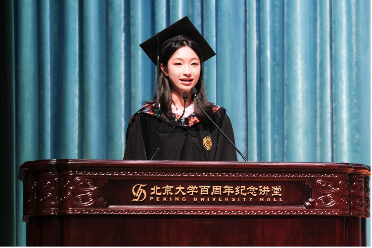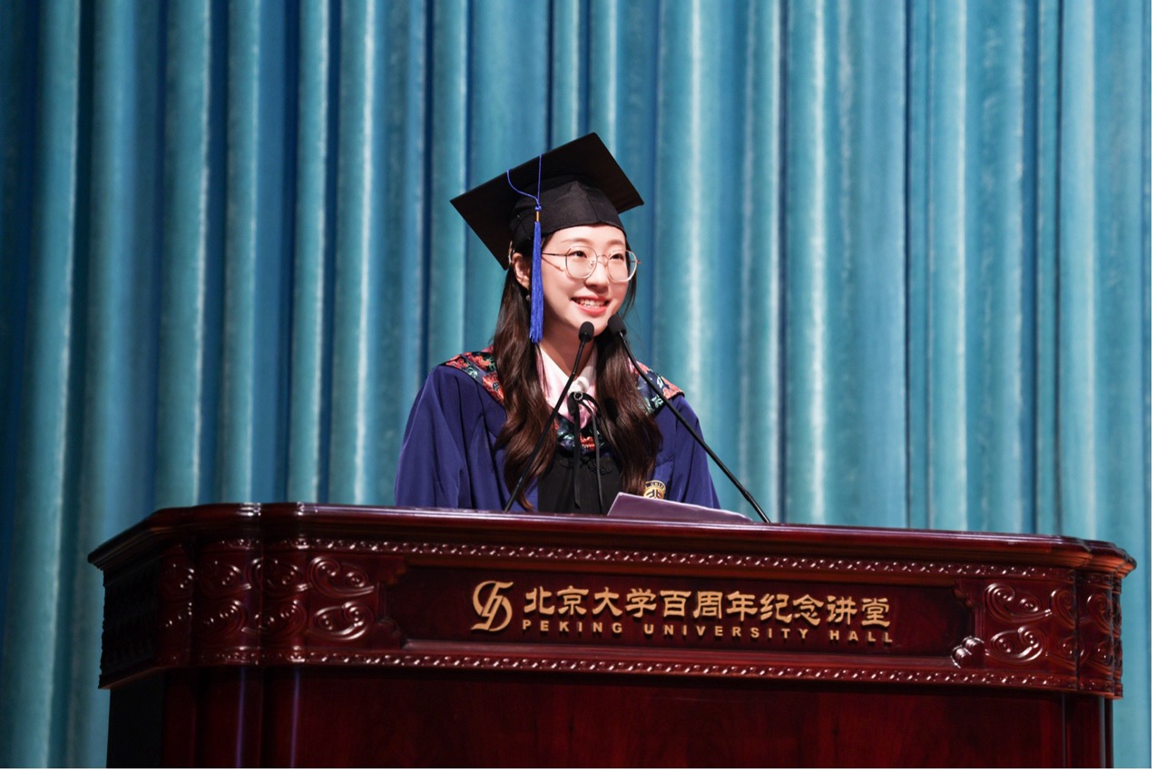 2022级朝韩语系硕士生张可佳作为硕士毕业生代表发言,以“外语、文学、中国立场”三个关键词,总结了北大外院人精神的三重底色。她讲述了自己七年语言学习的“罗曼史”、在文学研究中体悟生活的深度,以及在社会实践中体认“讲好中国故事”的使命。她强调,外语学习不仅塑造了专业能力,也赋予了理解世界、沟通他者的方式;而“文学”与“立场”,更是在人生道路上不断照亮前行方向的精神灯塔。