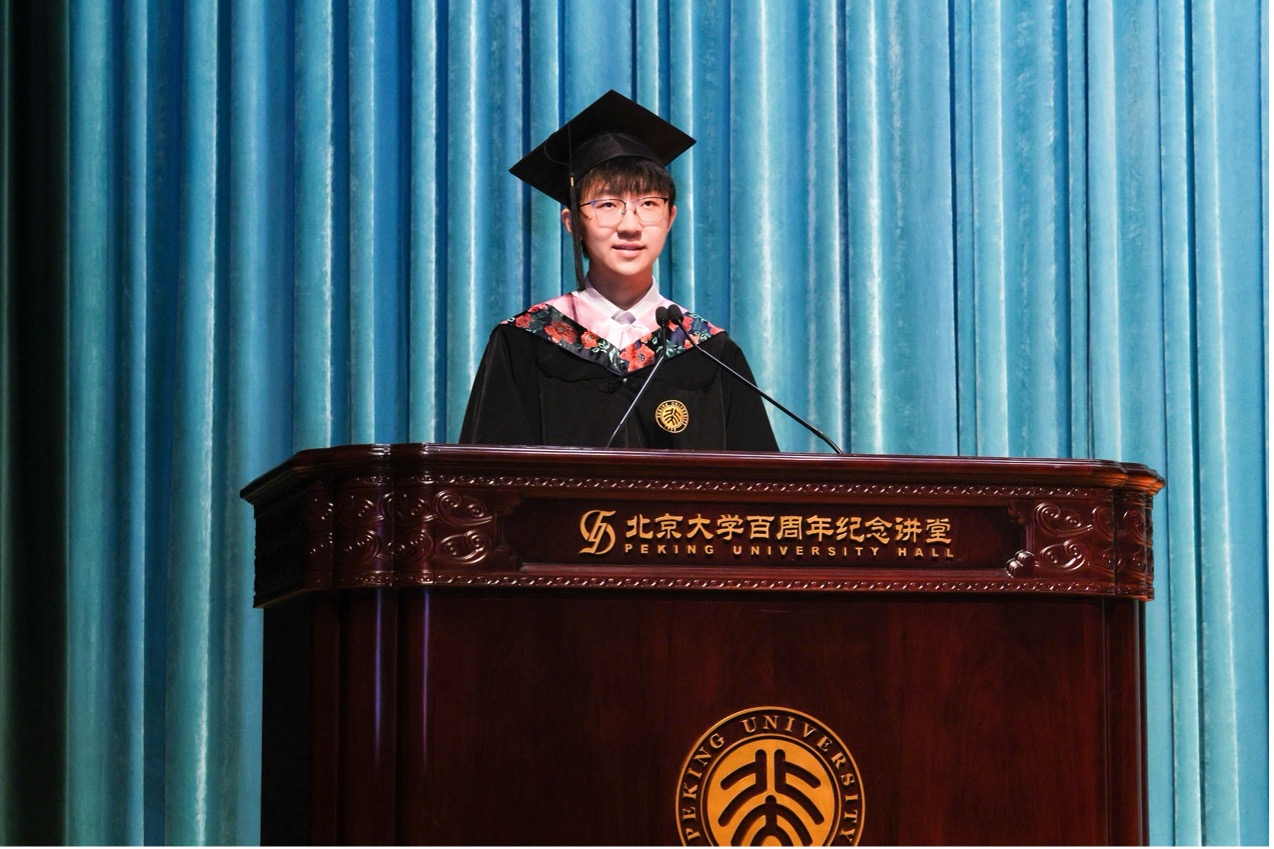 叶子青回顾了初入燕园时喊出的“爱推动我,让我说话”这句意大利语诗句,如今已成为四年外院生活最动人的注脚。从最初“因分数而来”到因热爱沉浸于意大利文学,她用一份“无用之用”的文学之爱,讲述了青年人对人文精神的坚守。同时,她分享了在中外交流、外事实践中的经历,以及投身国家外交事业的初心。她说:“毕业不是终点,而是新的起点。愿我们都能继续以爱为帆,沟通作桨,在人生的海洋上乘风破浪。”