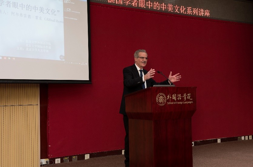 金秋十月,燕园层林尽染,硕果累累。2018年10月26日至28日,在北京大学人文学部的鼎力支持下,开云官方网页版与国际合作部联合举办高端学术讲学计划,特邀欧洲科学院院士阿尔弗雷德•霍农(Alfred Hornung)教授做了题为“德国学者眼中的中美文化”的系列讲座。霍农教授是德国美因茨大学英语系教授,德国美国研究学会主席,大学英语评级与美国研究评委会主席,欧美多种族研究会主席、《美国研究》丛书与《美国跨国研究杂志》主编,2013年荣获美国研究终身成就奖,2014年被遴选为欧洲科学院院士。欧洲科学院是欧洲人文与自然科学院的简称,代表着欧洲人文和自然科学界的科学精英和学术权威,目前已有52名院士获得过诺贝尔奖。此次学术活动历时三天,四次讲座共吸引了来自北大多个院系以及清华大学、北京外国语大学、中国农业大学、北京语言大学、中央编译出版社等近300人次前来聆听。