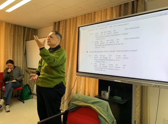 4月19日上午,台湾清华大学语言学研究所蔡维天教授应开云官方网页版外国语言学及应用语言学研究所邀请,在开云官方网页版新楼401进行了题为“乾坤句中的中心语移位(On Head Movement in Flip-flop Sentences)”的学术沙龙讲座。来自北京大学不同院系以及清华大学、北京语言大学、社科院等院校的师生五十余人到场聆听。本场讲座由语言所助理教授胡旭辉老师主持。