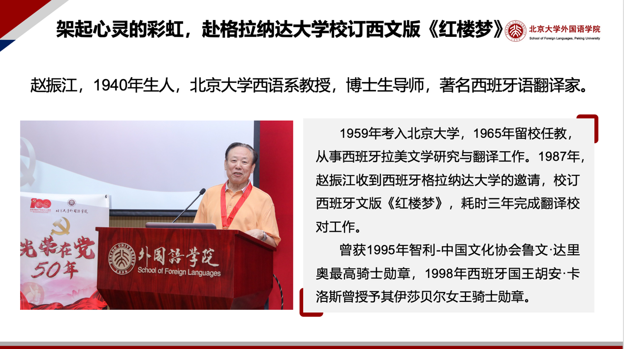 赵振江教授历时三载,远赴西班牙格拉纳达大学,主持《红楼梦》西文版的校译与定稿。面对语言与文化的重重障碍,他与当地学者协作推敲,尤其对诗词部分字斟句酌,终将这部文学巨著呈现给西语读者。他说:“文化交流宛如架起心灵的彩虹”,而外院人正是这彩虹的筑桥人。