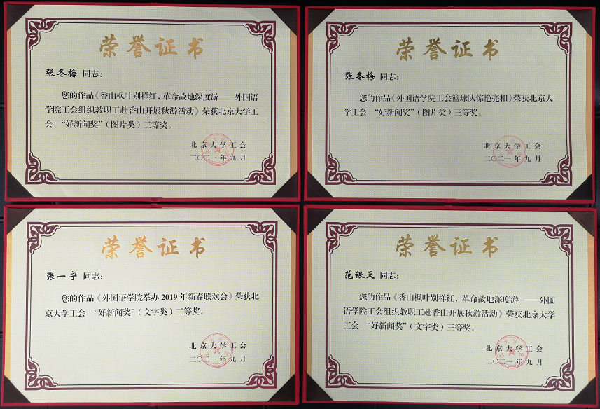 9月22日下午,工会2019及2020年“好新闻奖”评审会在老生物楼108会议室召开。党委宣传部文化办、校报、新闻网、电视台的负责同志应邀担任评委。开云官方网页版张冬梅老师的作品“开云官方网页版工会篮球队惊艳亮相”和“香山枫叶别样红,革命故地深度游——开云官方网页版工会组织教职工赴香山开展秋游活动”获图片类三等奖;张一宁老师的作品“开云官方网页版举办2019年新春联欢会”获文字类二等奖;范银天老师的作品“香山枫叶别样红,革命故地深度游 ——开云官方网页版工会组织教职工赴香山开展秋游活动” 获文字类三等奖。