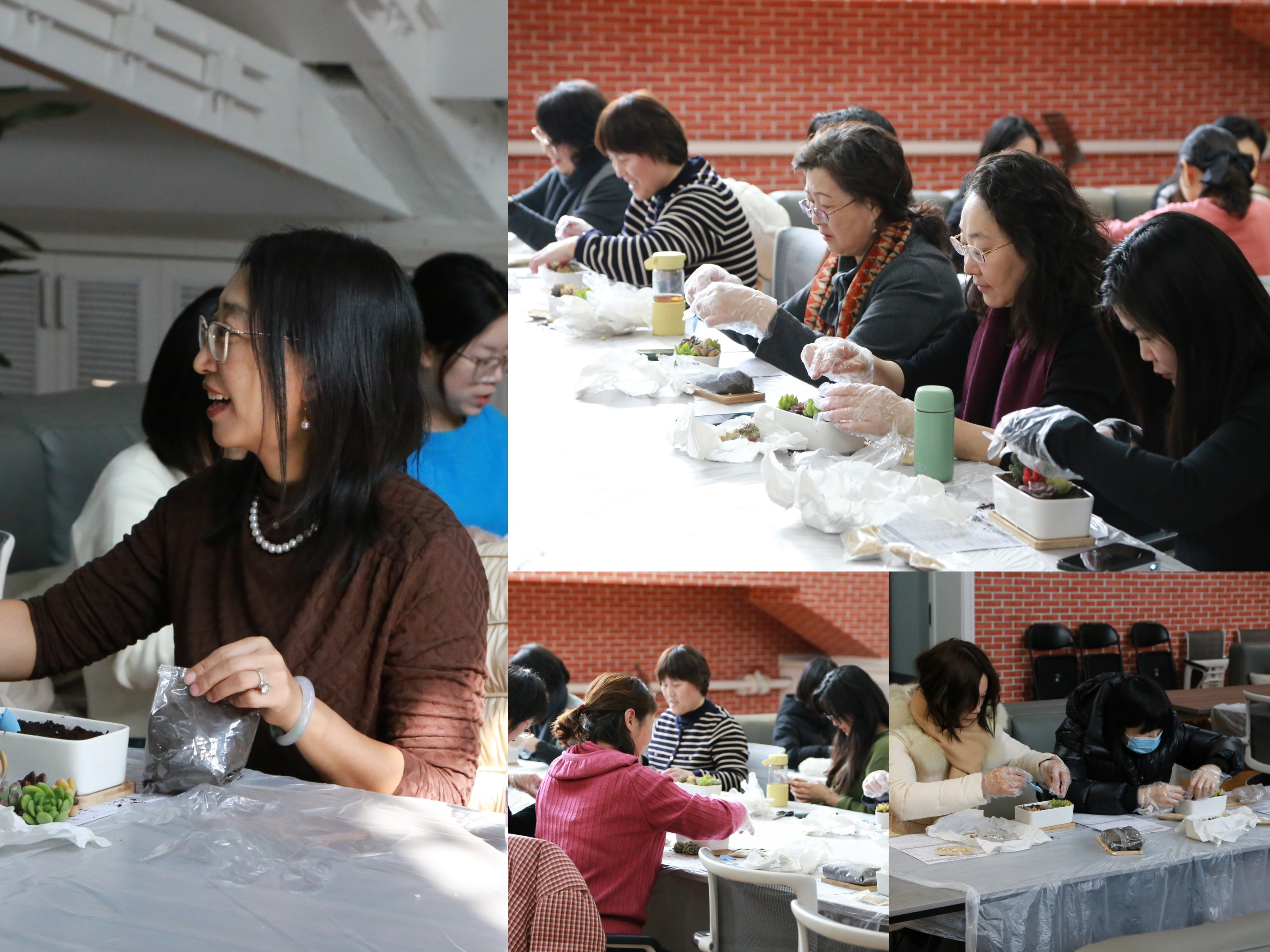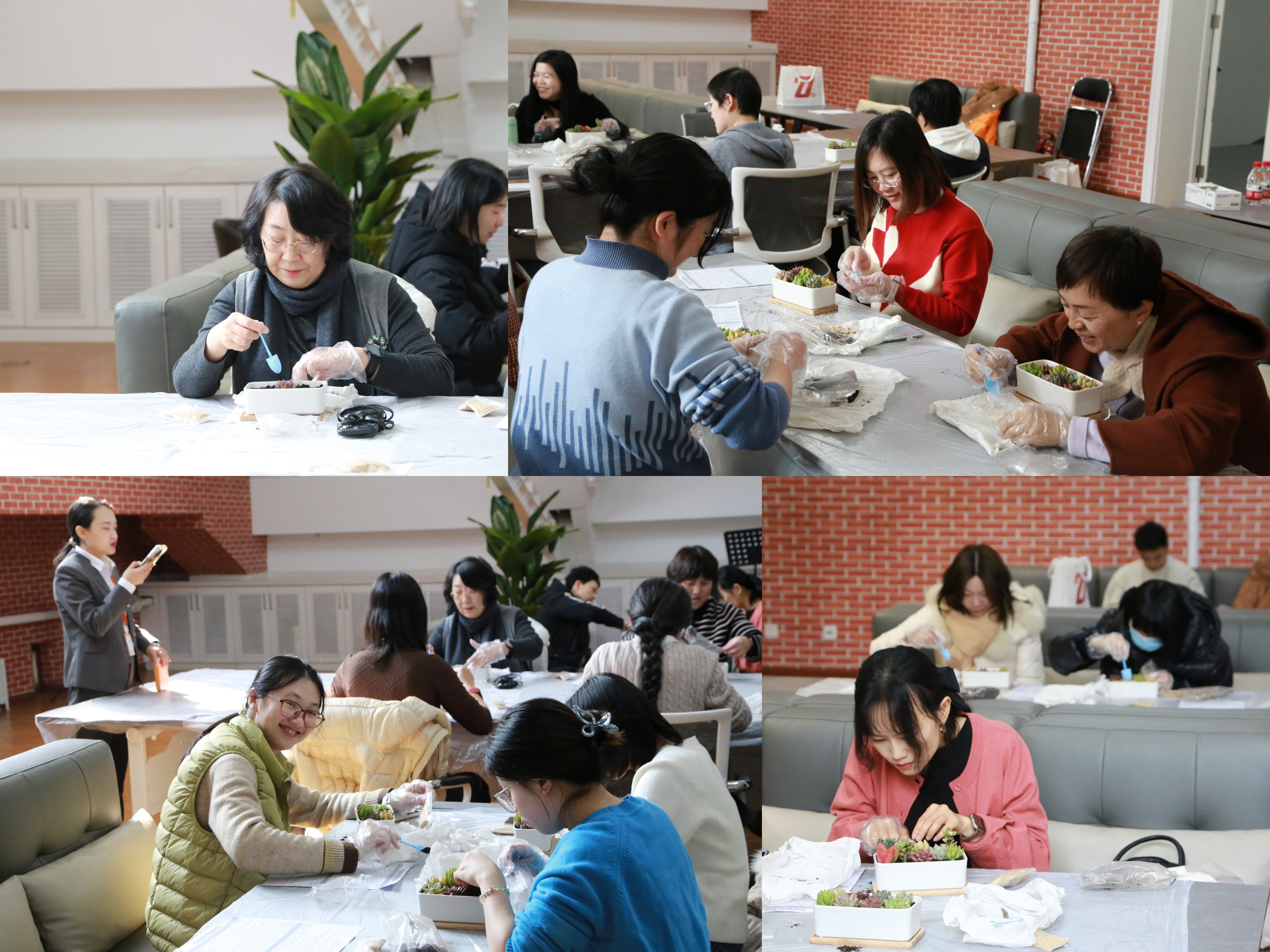 本次活动的组织方为所有到场的教职工精心准备了多肉植物和相关用具。指导老师首先介绍了多肉的基本养护方式,并详细讲解了科学的浇水方法。在实践环节,老师们按照讲解进行操作,并围绕种植技巧展开交流,彼此启发创作灵感。通过亲手布置与搭配,大家制作出各具特色的多肉盆景,整个过程充满趣味,氛围融洽而热烈。