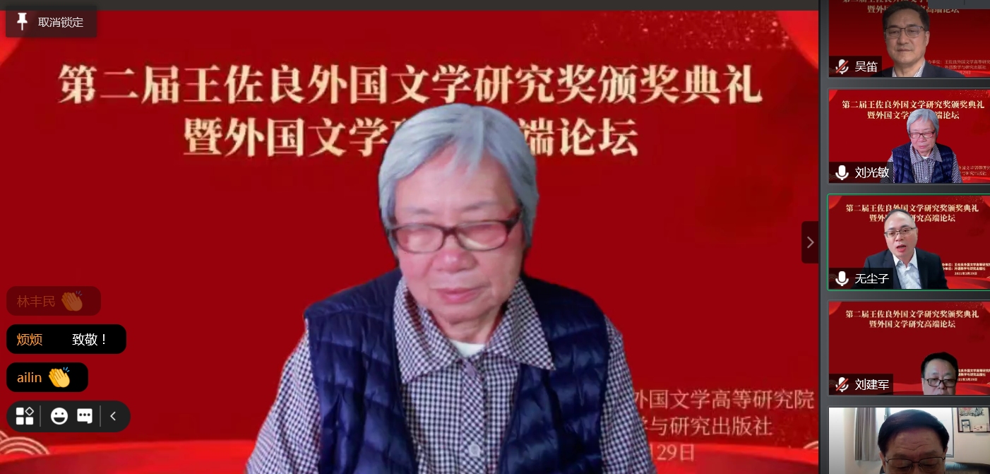 仲跻昆夫人刘光敏代表于2020年4月去世的仲跻昆发表了感言。她表示,《阿拉伯文学史》是仲跻昆教授近20部著作和译作当中最为重要的一部。她讲述了仲跻昆教授生前热爱诗歌、热爱朗诵、热爱翻译、热爱学术研究的点滴,并朗诵了一首仲跻昆教授翻译的纪伯伦作品《花之歌》。