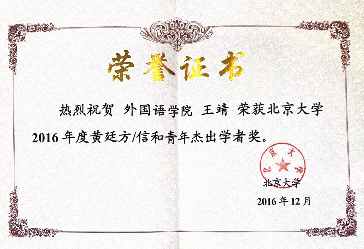 王靖及其所获“北京大学黄廷方/信和青年杰出学者奖”