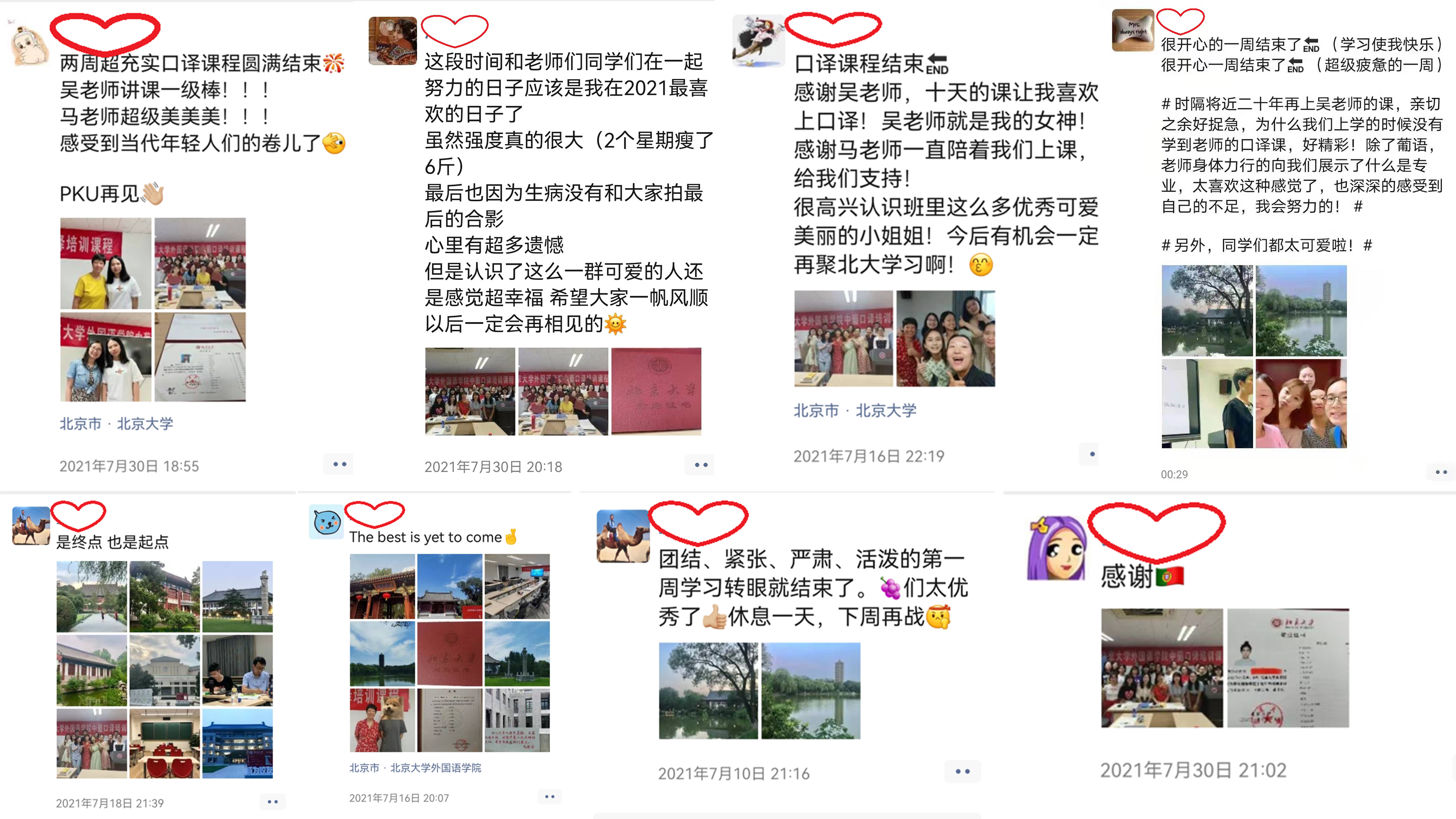 中葡口译培训课程首届学员来自全国各地,地域分布广泛。其中有已完成大学本科三年级学习的葡语专业在校学生,也有已经或即将从事相关领域的工作人员。学员们纷纷表示,本次培训课程理论与实践相结合,是对中葡口译课程一次全方位、系统性的梳理和讲解;自己因此在语言学习和专业素养上都得到了切实的提高,收获颇丰,更加坚定了将来从事专业方向的决心和信心。同时,学员还表示虽然课程强度很大,但学习氛围却友好活泼,师生关系融洽,自己非常开心能在燕园度过愉快又紧张的十天学习时间。