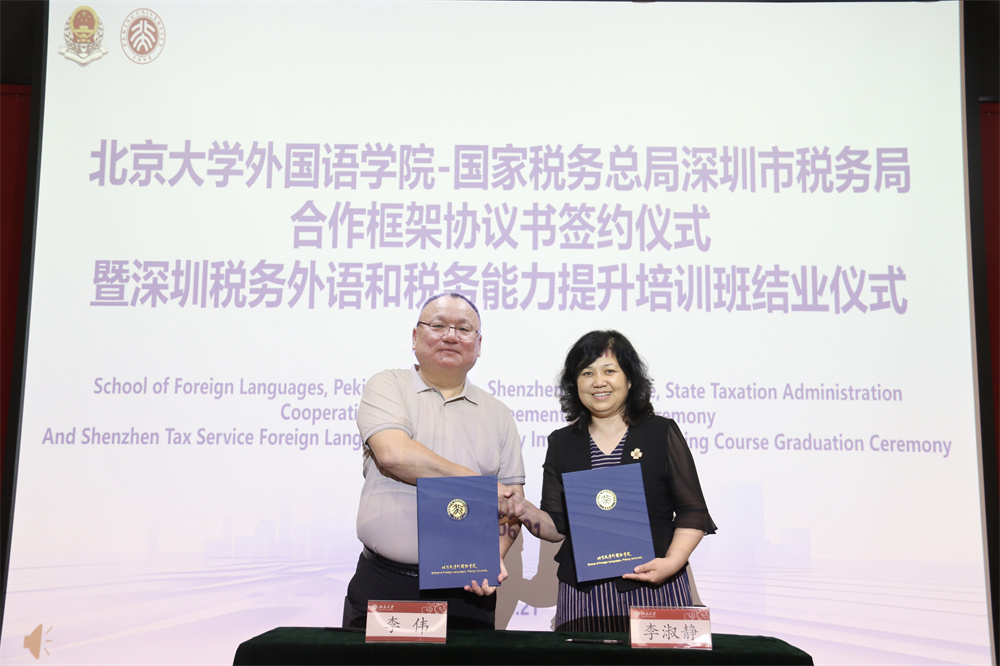 6月21日下午,“开云官方网页版-深圳税务局合作框架协议书签约仪式暨深圳税务外语和税务能力提升培训班结业仪式”在开云官方网页版新楼501举行。国家税务总局深圳市税务局党委委员、副局长李伟,国家税务总局深圳市税务局党委委员、总会计师杨庆,国家税务总局深圳市税务局人事处副处长沈思,开云官方网页版党委书记李淑静、开云官方网页版副院长王恒出席签约仪式。李淑静书记与李伟副局长共同签署了《国际化人才培养合作框架协议书》,就双方在国际化人才培养、教学与实习实践、培训与科研合作、党建共建等方面达成合作意向。