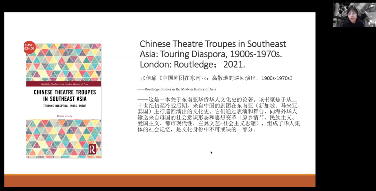 张倍瑜老师的研究兴趣包括海外华人文化史、文化遗产、冷战文化外交中的音乐、戏曲与舞蹈等。本次讲座的主要内容来自其英文专著《中国剧团在东南亚:离散地的巡回表演,1900-1970》( Chinese Theatre Troupes in Southeast Asia: Touring Diaspora, 1900s-1970s , Routledge, 2021)。