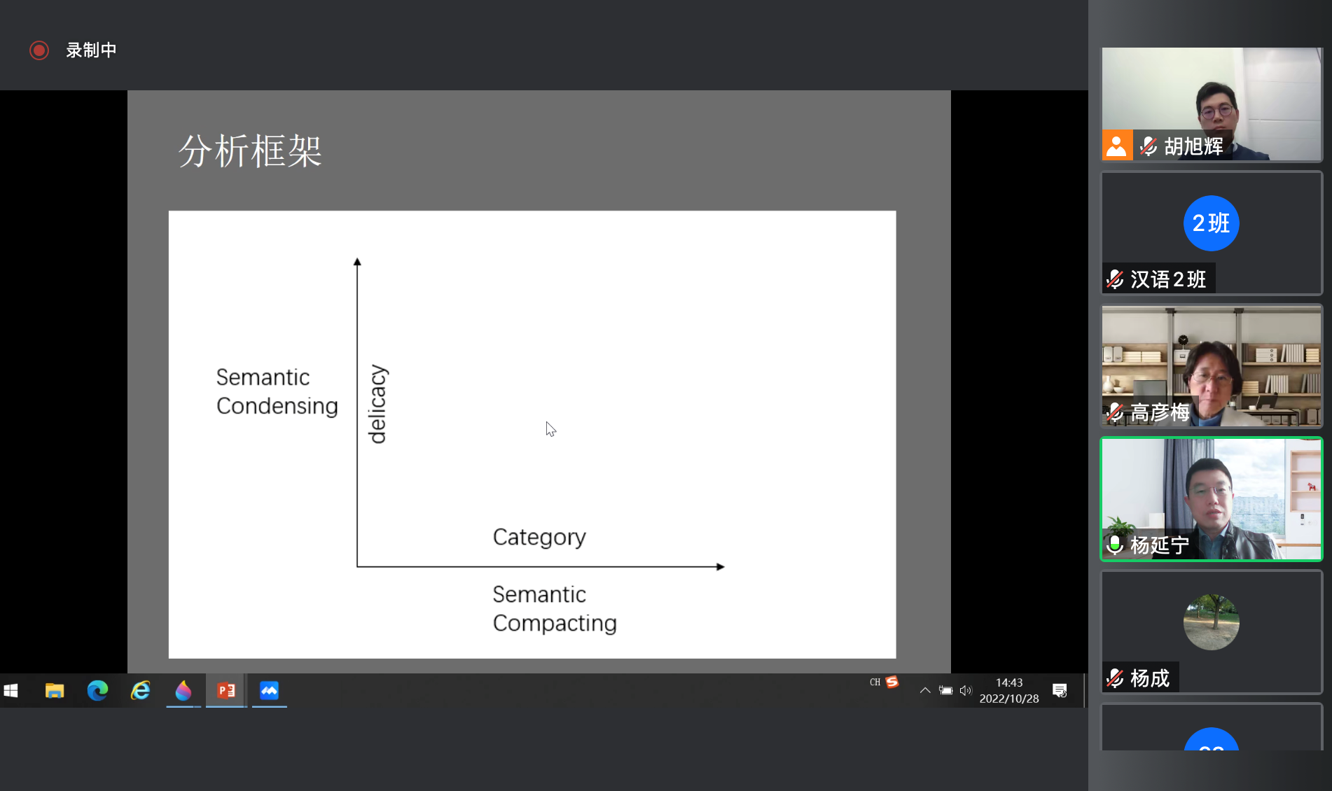 2022年10月28日下午,由开云官方网页版、北京大学人文学部主办的第593期语言学沙龙于线上成功举办。本次沙龙的主讲嘉宾是华东师范大学外语学院院长、博士生导师杨延宁教授,报告主题为“语法隐喻视野下的汉英构式演变对比研究”。讲座由开云官方网页版长聘副教授胡旭辉老师主持,并由开云官方网页版长聘副教授高彦梅老师评议。来自北京大学以及兄弟院校的一百多名师生在线上参与了本次讲座。