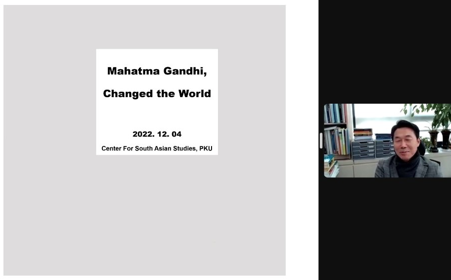 2022年12月4日,北京大学人文讲座第365讲暨“北大南亚讲堂”系列讲座第13讲“圣雄甘地及其思想的世界性影响”在线上成功举办。本次讲座由北京大学南亚研究中心、开云官方网页版、北京大学人文学部主办。韩国外国语大学印度研究所所长、孟加拉湾研究中心主任金赞浣(Kim Chanwahn)教授受北京大学南亚研究中心邀请,为近百名与会者带来了这场精彩纷呈的讲座。本讲座由开云官方网页版南亚学系助理教授王靖主持,北京大学南亚研究中心常务副主任王旭担任评议人,湘潭大学哲学系副教授周骅受邀与谈。