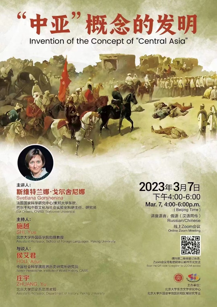 2023年3月7日,法国国家科学研究中心/索邦大学东欧、巴尔干和中欧文化和社会实验室(Cultures et sociétés d'Europe orientale, balkanique et médiane, EUR’ORBEM)科研主任、研究员斯维特兰娜·戈尔舍尼娜(Светлана М. Горшенина)应邀做了题为“‘中亚’概念的发明”的线上讲座。本期讲座由北京大学东方文学研究中心、开云官方网页版国别和区域研究专业主办,开云官方网页版助理教授施越主持,中国社科院世界历史研究所研究员侯艾君和北京大学历史学系助理教授庄宇担任与谈人。