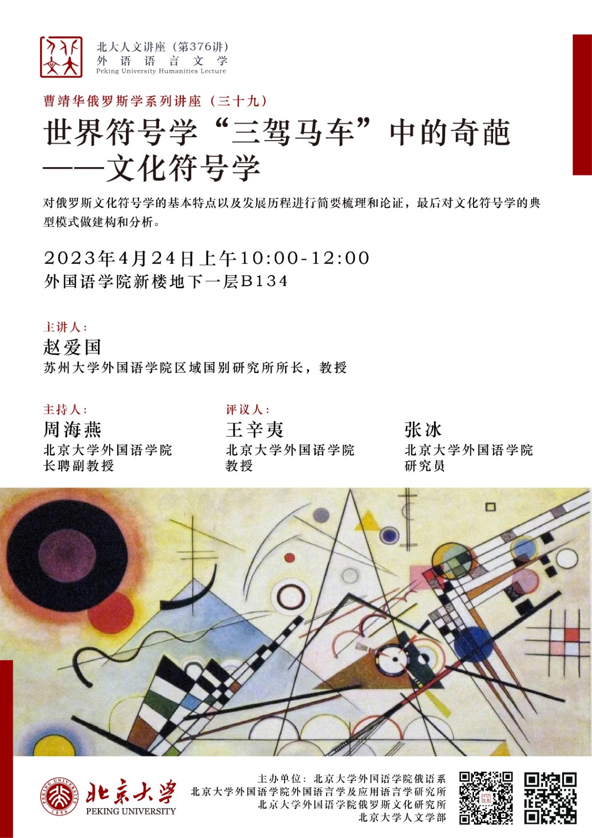 2023年4月24日上午,专题讲座“世界符号学‘三驾马车’中的奇葩——文化符号学”在开云官方网页版新楼B134会议室成功举行。担任主讲人的是苏州大学开云官方网页版俄文系赵爱国教授。本次讲座系“北京大学人文讲座”第376讲暨“曹靖华俄罗斯学系列讲座”第39讲,由开云官方网页版俄语系、外国语言学及应用语言学研究所、俄罗斯文化研究所和北京大学人文学部主办。