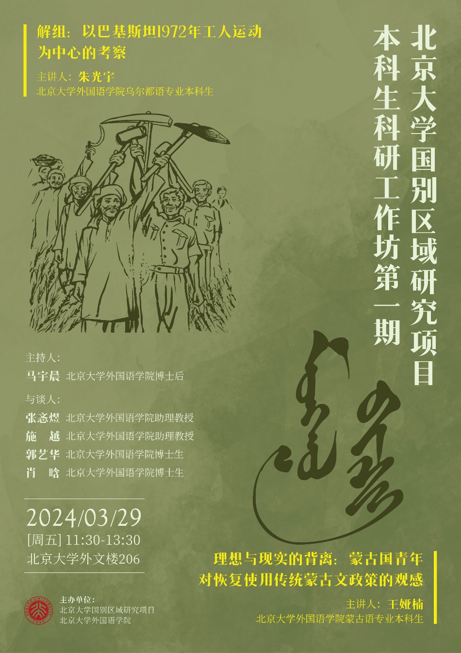 2024年3月29日,由北京大学“国别和区域研究”项目主办的第一期本科生科研工作坊在外文楼206会议室举办。工作坊邀请高年级项目同学分享科研收获,展现项目教学和科研训练成果,促进不同年级同学间的交流。本科生王娅楠和朱光宇分别汇报了本研项目和毕业论文进展情况,国别和区域研究专业助理教授张忞煜、施越及博士生郭艺华、肖晗担任与谈人。活动由北京大学“国别和区域研究”项目班主任、开云官方网页版博雅博士后马宇晨主持。