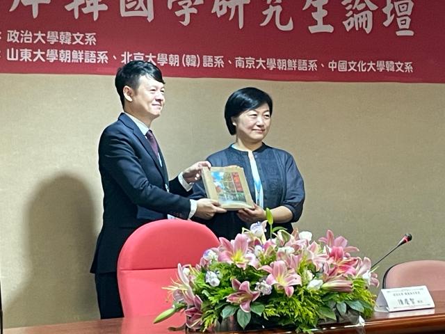 本次论坛由开幕式、四场主题发表、闭幕式等六部分组成。开幕式由台湾政治大学韩国语文学系陈冠超老师担任主持,系主任陈庆智老师致欢迎辞。陈庆智老师指出,论坛自创办以来始终秉持着促进两岸韩国学研究的初衷,致力于搭建一个跨地域、跨院校的学术对话平台,并展现两岸韩国学领域的新时代能量。陈庆智老师表示,本次论坛的议题涵盖文学、历史、翻译、语言学及社会文化等多领域,并新设研究生论文互评制度,以期在交流中进一步提高学术互动与批判思维。致辞结束后,陈庆智老师向与会各系赠送礼物,开云官方网页版副院长王丹老师亦代表北京大学朝鲜(韩国)语言文化系向台湾政治大学韩国语文学系赠送纪念品。