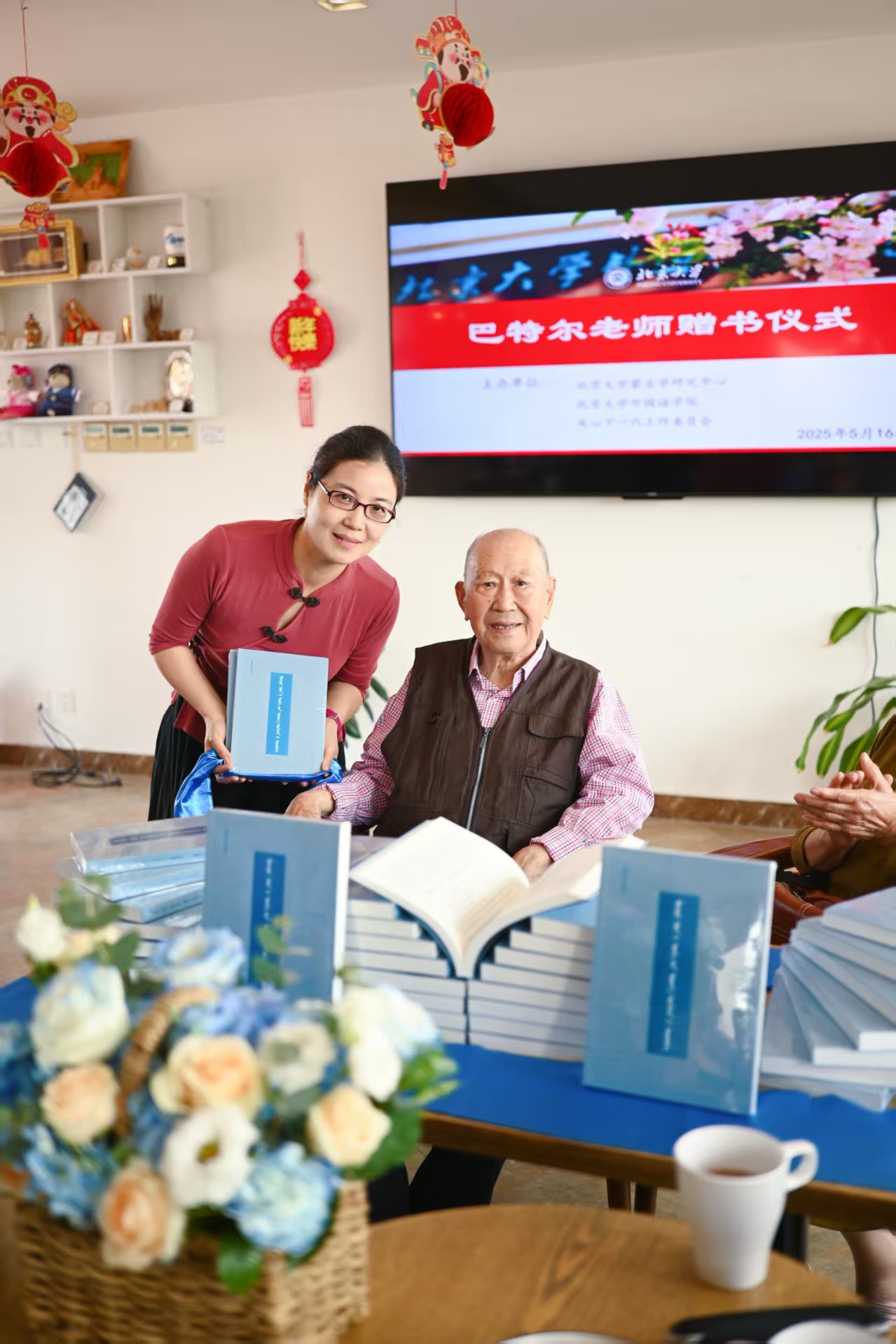 2025 年 5 月 16 日,"巴特尔教授赠书仪式" 在北大外院新楼咖啡书苑举行。活动现场,巴特尔教授依照蒙古族传统习俗,将凝聚毕生心血的学术专著《蒙古语语义应用研究》郑重赠予外院分馆馆长张晓雁,标志着这部重量级学术著作正式入藏院图。