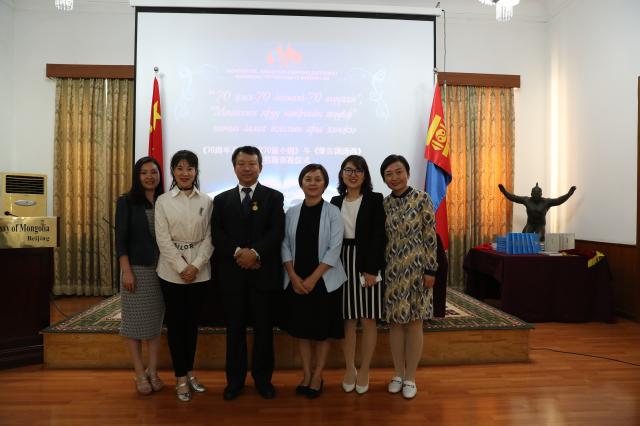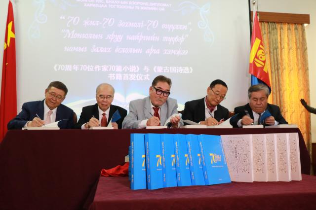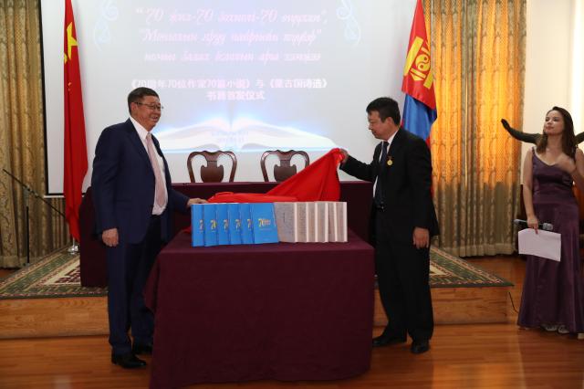 2019年9月27日,《70周年70位作家70篇小说》(蒙古文版)和《蒙古国诗选》(中文)图书首发仪式在蒙古国驻华大使馆会议室举行。中国外交部亚洲司陈少春参赞、蒙古国驻华大使丹•钢呼雅格、前中华人民共和国驻蒙古国大使黄家骙、三位前蒙古国驻华大使和《“一带一路”沿线国家经典诗歌文库》主编赵振江教授以及来自中国作家协会、中国文字著作权协会、中国社会科学院、北京大学、中央民族大学和媒体代表等共120余人参加了首发仪式。