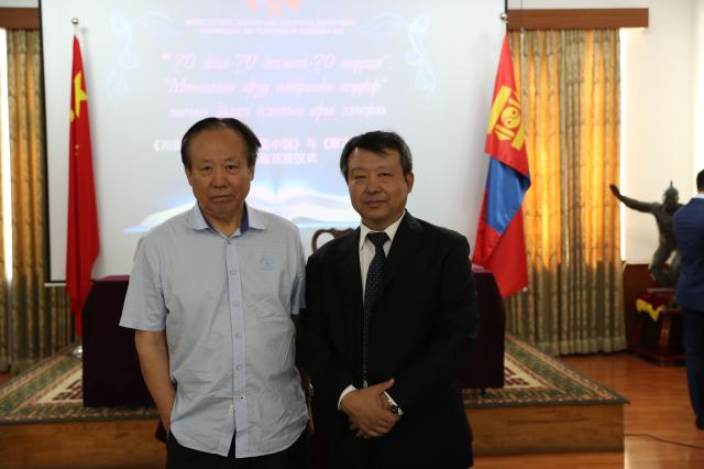 陈岗龙教授与《“一带一路”沿线国家经典诗歌文库》主编赵振江教授在蒙古驻华使馆