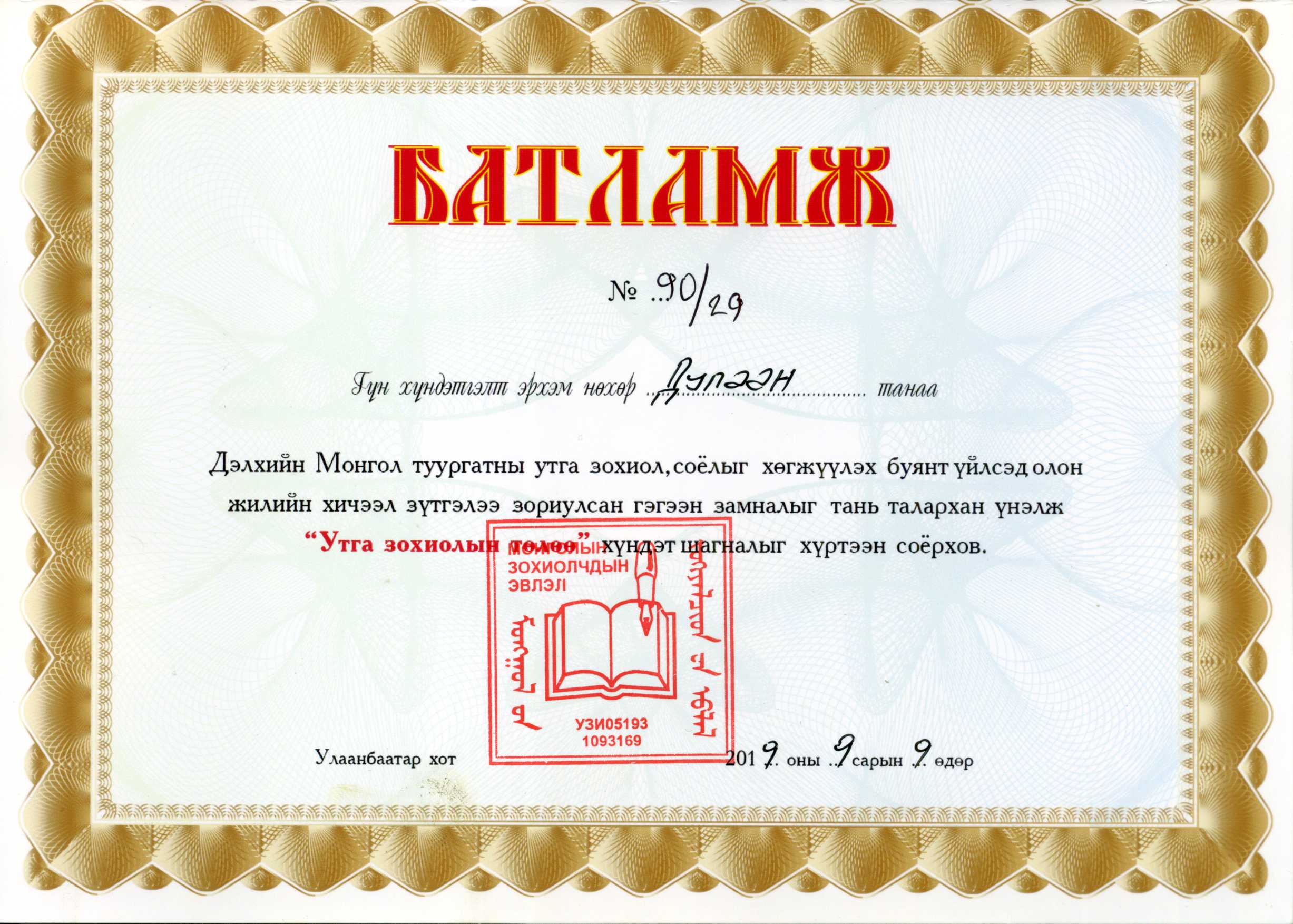 蒙古国作家协会文学贡献奖证书