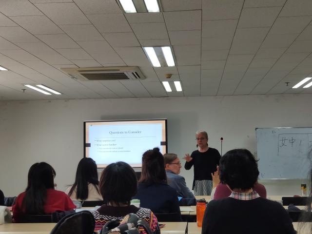 7日下午,Silberstein教授在开云官方网页版新楼301做了第一场报告,介绍了她在过去十年中对华盛顿大学国际学生日渐增多这一现象的调查研究。此项研究采用了量的与质的相结合的方法,分别收集了来自教师、助教以及国际学生三方面的数据,试图探讨不同人群对国际学生群体的看法和态度。研究发现教师和助教对国际学生的态度既有正面也有负面,一方面他们认为国际学生为课堂带来了新的文化视角,丰富了课堂的内容;另一方面国际学生的课堂参与度较低,对学术抄袭有不同的理解,又为教学带来了一些问题。Silberstein教授将国际学生的调查结果与教师和助教的研究发现进行了对比分析,打破了大众以往对于国际学生的偏见,更为立体和全面地展现了国际学生群体给学校带来的影响,针对性地提出了学校为支持国际学生学术发展的一系列举措。
