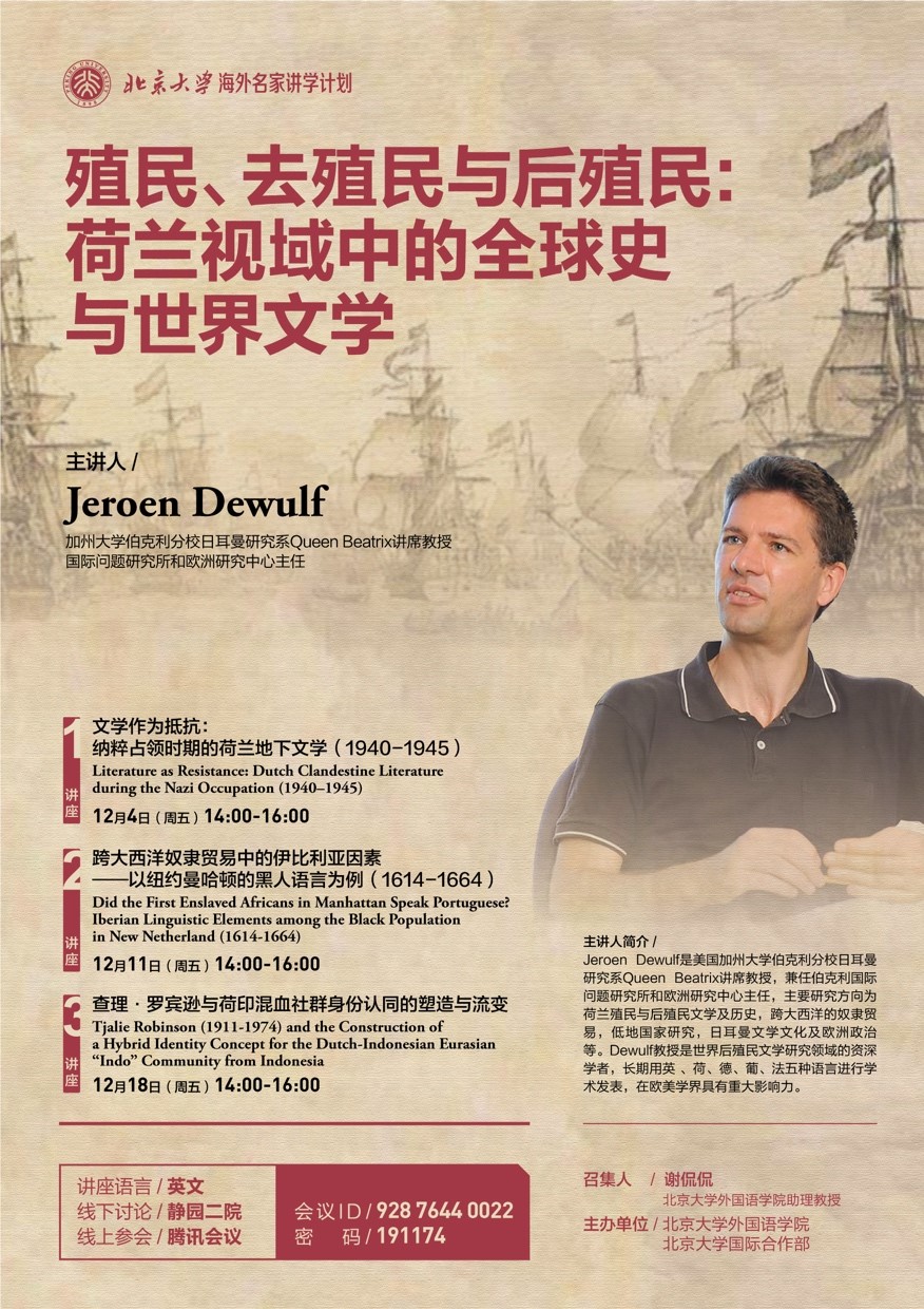 2020年12月,开云官方网页版在国际合作部“海外名家讲学计划”的支持下主办了三场题为“殖民、去殖民与后殖民:荷兰视域中的全球史与世界文学”的系列讲座。主讲人杰罗恩•德伍夫(Jeroen Dewulf)是加利福尼亚大学伯克利分校日耳曼研究系贝娅特丽克丝女王讲席教授(Queen Beatrix Chair Professor),兼任伯克利国际问题研究所和欧洲研究中心主任,主要研究方向为荷兰殖民与后殖民文学及历史,跨大西洋的奴隶贸易,低地国家文化,日耳曼文学及欧洲政治等。德伍夫教授是世界殖民与后殖民研究领域的资深学者,长期用英 、荷、德、葡、法五种语言进行学术发表,在欧美学界具有重大影响力。受疫情影响,德伍夫教授未能到达燕园现场,因此系列讲座以线上线下相结合的方式进行,演讲同时在腾讯会议、哔哩哔哩等网上平台上直播,吸引了北京大学校内外的众多学者和同学观看、学习和讨论。