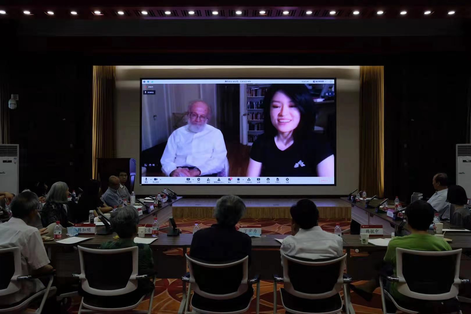 2021年7月4日上午,唐纳德•斯通教授追思会于民主楼208会议室召开。北京大学英语系高峰枫、刘意青、丁宏为、韩敏中、韩加明、刘建华 、Tom Rendall、苏薇星等多位老师及英语系各届同学,中国社会科学院陆建德,首都师范大学杜维平和王峥教授,北京大学赛克勒考古艺术博物馆副馆长曹宏等在线下参会,另有一百余人通过腾讯会议线上参会,共寄哀思。本次追思会由英语系纳海老师主持,邀请斯通老师的亲人及中国朋友们依次发言,分享与斯通老师有关的回忆和故事。