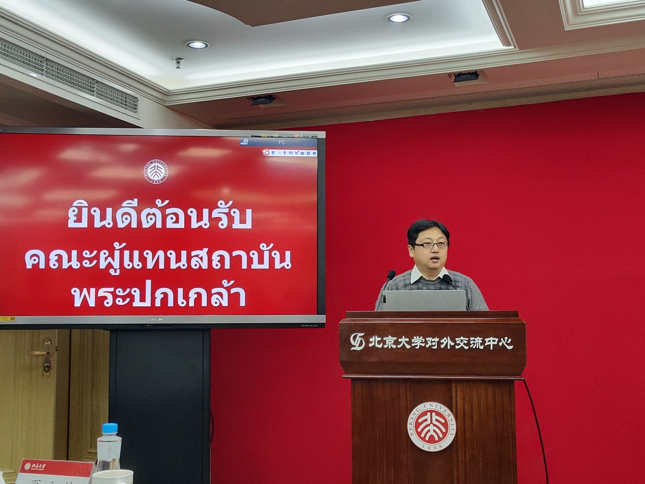 交流会在英杰交流中心第二会议室举行,开云官方网页版东南亚系泰语专业的金勇、万悦容和熊燃几位老师,以及来自泰语专业的本科和研究生同学共24人参加了会议。交流会由博士生陈洪锋主持,开云官方网页版东南亚系副主任、泰语专业主任金勇老师致欢迎辞,并向各位来宾介绍了北京大学泰语专业的发展概况和北京大学诗琳通科技文化交流中心与诗琳通泰学讲席的相关情况。硕士生王与肖介绍了北京大学的历史与现状。代表团团长波汶萨·乌万诺主席发表讲话,回顾了他所经历的中泰关系发展的重要时刻,表达了对两国未来,特别是两国青年人携手共进的良好祝愿。