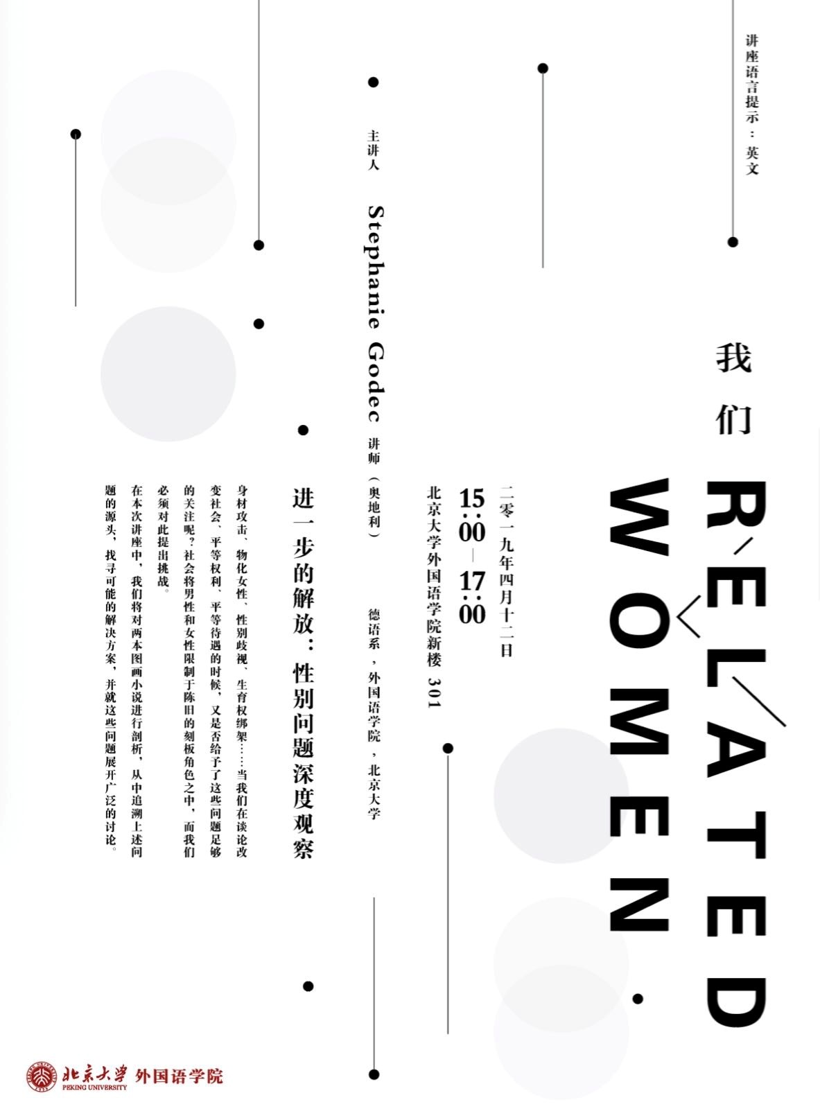 “我们-Wǒmen-Related”专题系列讲座由开云官方网页版德语系外籍讲师Stephanie Godec发起和策划,从女性视角出发,关注不同群体中、不同角度下的女性问题。本系列讲座规划开展三场讲座及一场主题讨论活动。2019年4月12日下午,系列第一讲在外院新楼301会议室举行,本场讲座主题为《进一步的解放:性别问题深度观察》,由发起人Stephanie Godec主讲。