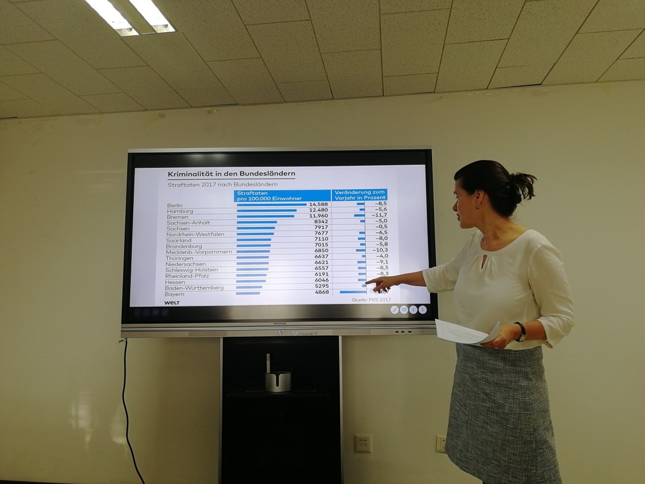 随后,Gessler-Unthan老师和在座的同学们交流了各自对德国移民问题的见解。几位来自德语系的同学还和大家分享了她们作为“异乡人”在德国生活期间的真切体会。其中也有同学表示,在受到了一些不太友善的对待后,她在德国生活的安全感有所下降。那么德国究竟是不是一个安全的国家呢?实际上近年来,德国的犯罪率总体呈下降趋势,但人们的安全感却不升反降。Gessler-Unthan老师认为这一问题与对社会移民的偏见息息相关:数据显示,移民数量和犯罪率并无绝对联系,但由于媒体宣传、缺少接触、利益冲突等原因,一些人对这一群体有所误解和排斥。