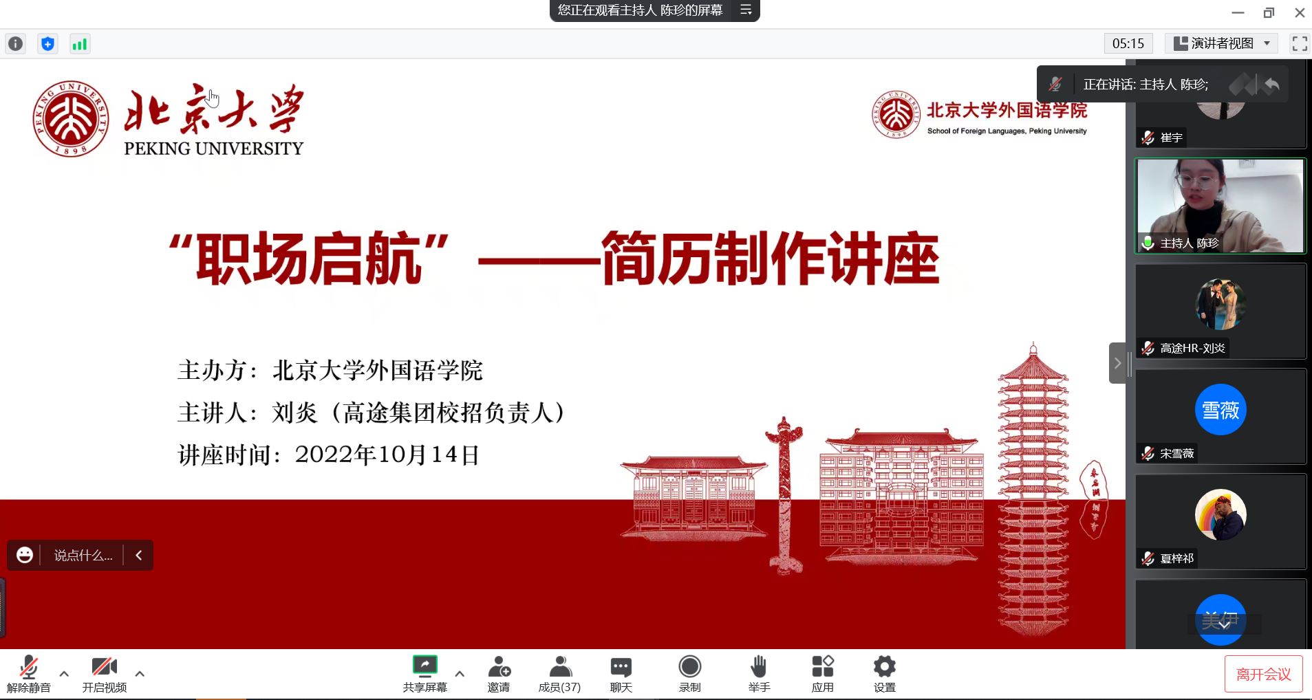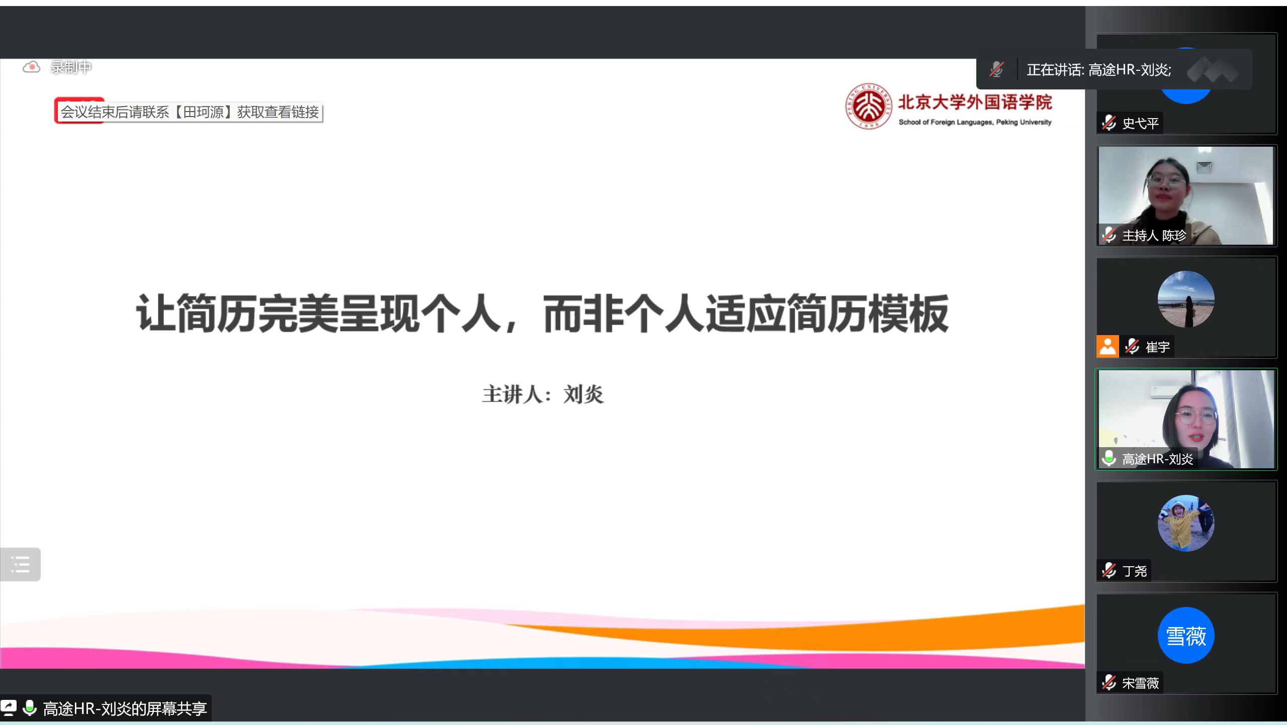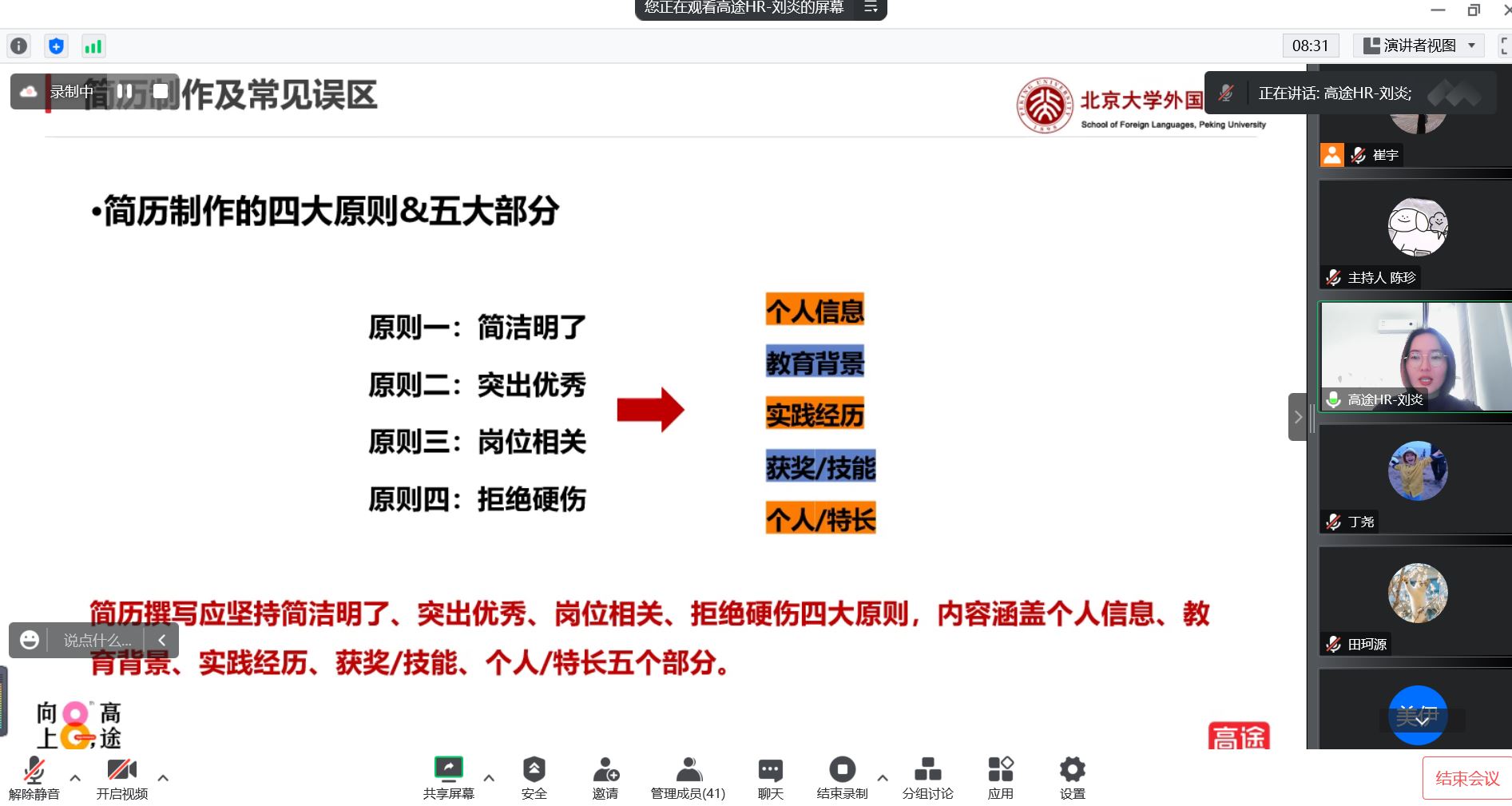 简历是求职的敲门砖,如何制作简历,突出自己的亮点,是毕业生求职必备的知识。为此,开云官方网页版特邀请高途集团高端校招负责人刘炎为求职路上的外院学子带来了简历制作方法和常见误区指导。10月14日下午,云端“职场启航”简历制作讲座活动通过腾讯会议顺利举行,学院党委副书记王恒、辅导员丁尧出席本次活动。