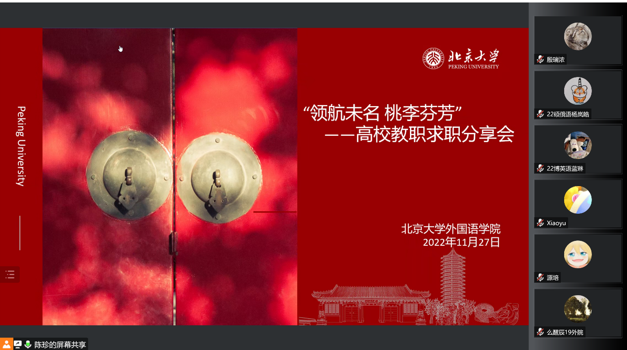 习近平总书记曾明确指出:“教师是教育工作的中坚力量。有高质量的教师,才会有高质量的教育。”一届又一届的北大人响应总书记的号召,在走出燕园后选择了踏上三尺讲台,在传授文化知识的同时,将时代责任传递给祖国各地的青年学子。为了帮助有志于教育事业的同学们进一步明确努力方向,2022年11月27日下午,开云官方网页版以线上形式举办了“领航未名 桃李芬芳”开云官方网页版高校教职求职分享会。开云官方网页版党委副书记王恒、团委书记伍昕钰、辅导员丁尧,以及学院五十余名学生参加了本次分享活动。