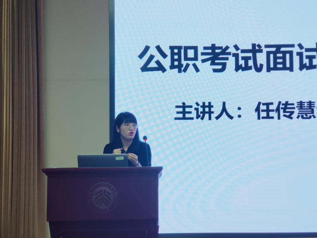 决赛按体制内、体制外分成三组开展模拟面试,每个小组分别由一位老师担任面试官,为参赛选手面试并打分。三组比赛结束后,任传慧结合A组面试情况对体制内面试技巧进行分享。她首先强调了面试应该具备良好的精气神和为人民服务的热情。接着她从面试礼仪、行为举止、着装要求、表达语言、思维逻辑等方面为同学们提供了一些建议。最后,她强调了针对自己的求职意向进行专项备考,以及提前学习了解面试流程、答题思路、快速审题方法、高频考点、热点知识等内容,对公务员考试的重要性。