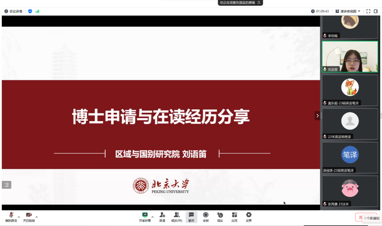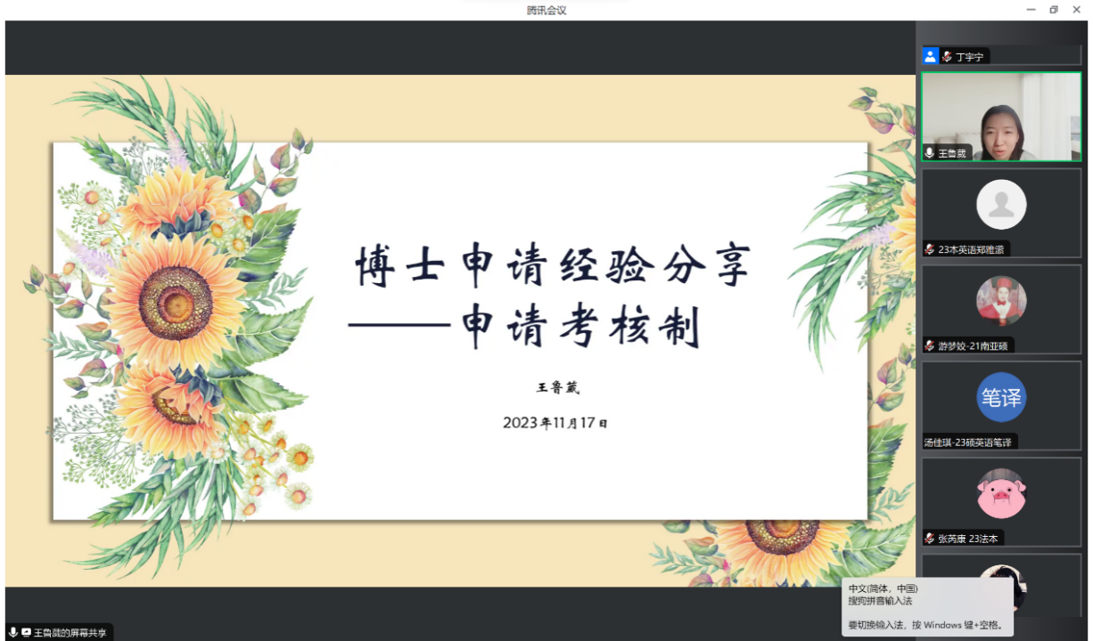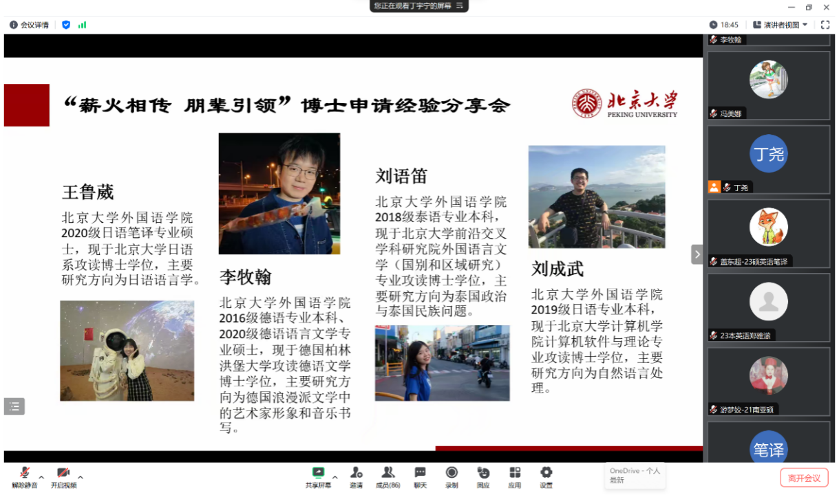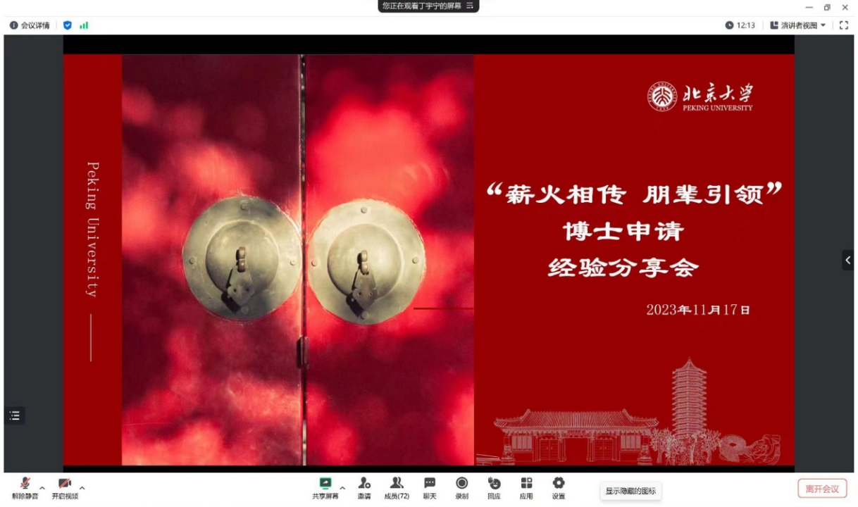为帮助外院学子了解博士申请流程以及博士就读体验,解答有志于攻读博士学位的同学所关切的问题,开云官方网页版于11月17日晚举办“薪火相传,朋辈引领”博士申请经验分享会,学院党委副书记冯美娜、辅导员丁尧出席,近百名同学参与活动。