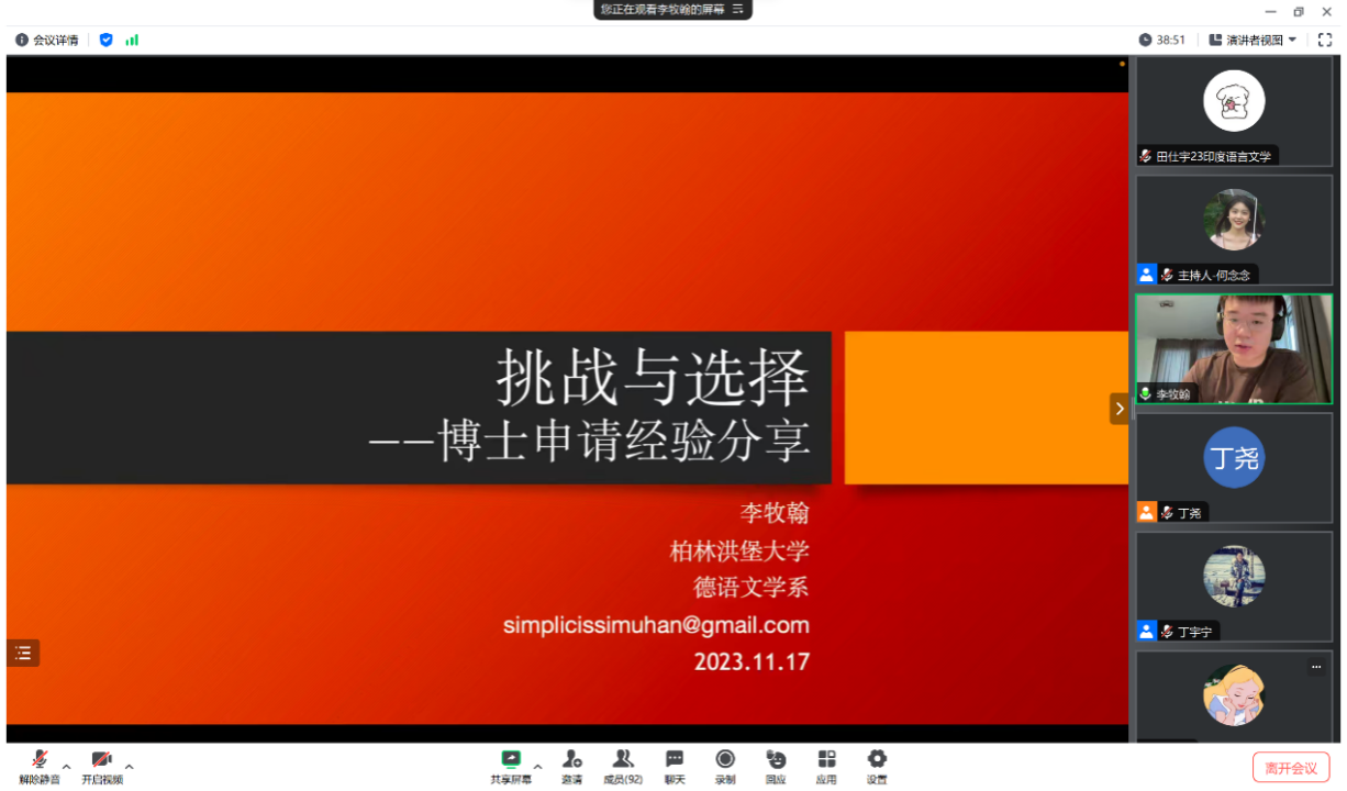 刘语笛从对区域国别学的介绍开始,延伸到个人申请经验以及读博感受。部分直博推免项目并不要求申请前就确定导师,但在申请阶段会要求提交代表性学术成果,并在面试阶段针对所提交的学术成果进行提问答辩。近年来的一些直博推免项目在复试阶段新增了笔试环节。普博生的申请流程大致相同,但会更早确定导师。刘语笛还介绍了不同类别博士生的不同学制、出国交换要求以及学术考核标准。谈及读博的意义,刘语笛表示,“读博最大的意义并不在于获取一纸证书,而在于独立治学、独立为人”。