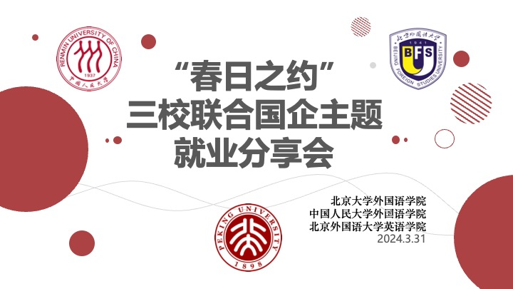 在致辞环节,冯美娜、李佳伟强调了本次就业分享会的重要意义。冯美娜谈到,国企是国民经济的重要支柱,同学们结合自身专业所学,以“外语+”的方式投身国企发展,实现自身价值,这是本次就业分享活动聚焦国企的缘由。北大、人大、北外三所学校的外语教学各有特色,同学们在求职路上也各有所长。希望以本次联合就业分享会作为良好开端,未来三校外语学子能够继续取长补短、交流共进,共同书写属于新时代的青春华章。李佳伟谈到,就业不只关乎个人前途,更与国家发展有着不可分割的联系。同学们在选择职业时,要观察国家政策导向、行业发展趋向、企业用人动向,提升洞察力与决断力,找准最能突出个人优势、最能发挥个人潜能的职场切入点,为实现中华民族伟大复兴的中国梦贡献自身力量。