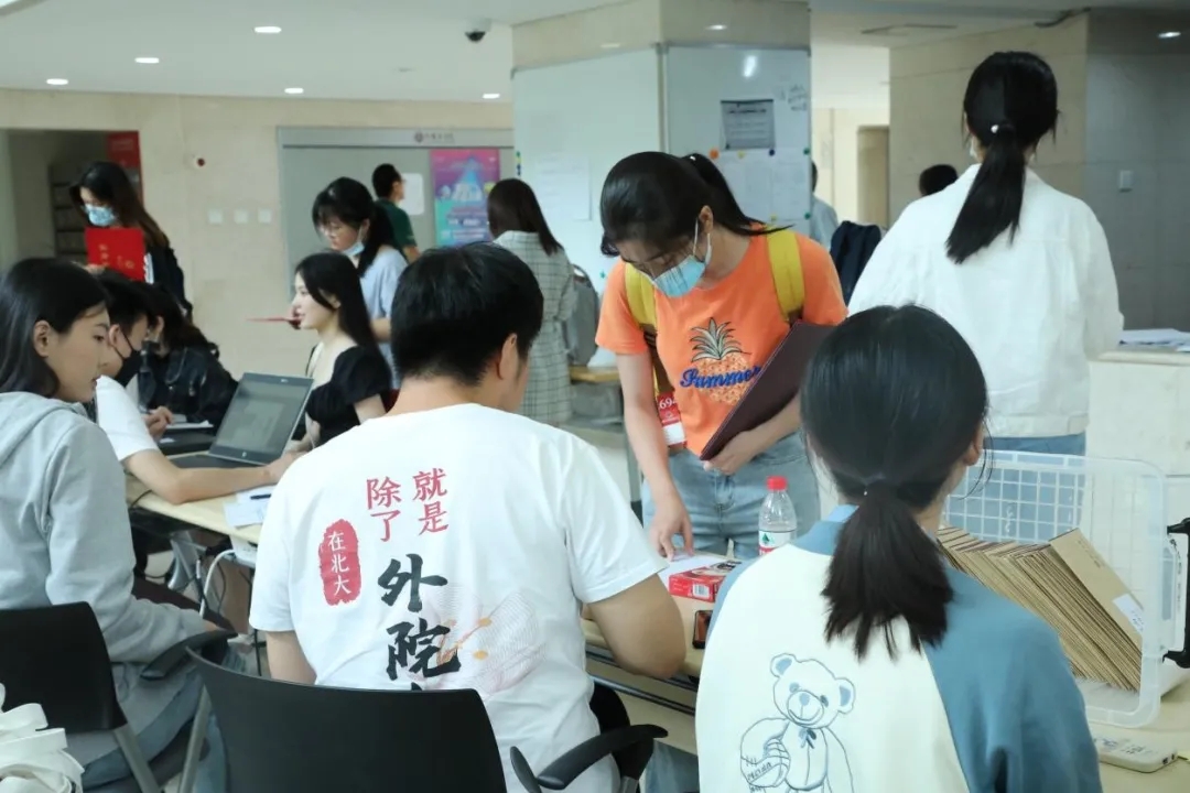 在老师和迎新志愿者的指引下,新同学们在依次完成系统报到、户口卡提交、档案材料提交等步骤之后,领取了外院为新入园的同学们精心准备的物料包,其中有学生手册、外院院衫、校园卡、绘有燕园四季景致的单页夹等物品,老师和志愿者耐心解答同学们的问题,嘱咐需要注意的事项,报到过程有条不紊地展开。