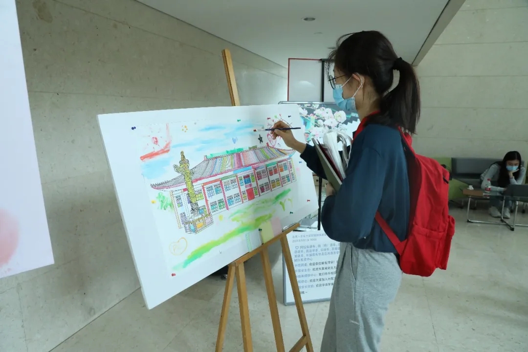 迎新现场,创意纪念区中有一张未上色完成的外文楼线稿吸引着新生的注意力。