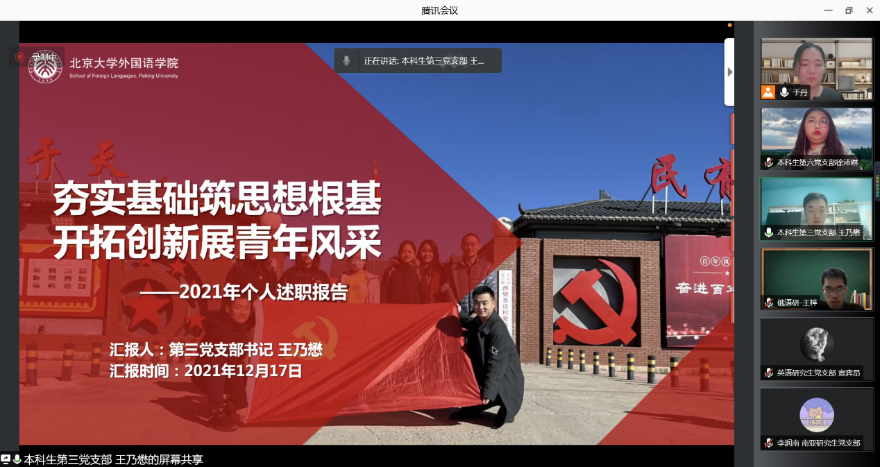 会议最后,李淑静充分肯定了本年度各学生党支部出色的工作表现,表示在建党百年之际,学院和支部层面成功开展了系列四史学习专题教育活动,“永远跟党走”党团日主题教育活动成效显著。各支部能够深度学习贯彻党中央重要战略部署与重要会议精神,并在第一时间学习领会党的十九届六中全会精神,同时能够结合自身专业特点,联合团支部组建海外党团学习小组,开展系列读书研讨会、实践与志愿服务工作,充分展现出学习求知热情、社会实践热情与志愿服务热情,并真正发挥了党建带团建促班建的积极作用。王恒表示,2022年,学院党委将继续大力支持各党支部开展系列党建教育活动,提供多元支持,办好具有外院特色的支部活动,并提醒各位支书要持续做好支部的组织建设、制度建设,做好党员的思想建设,以实际行动迎接党的二十大召开。