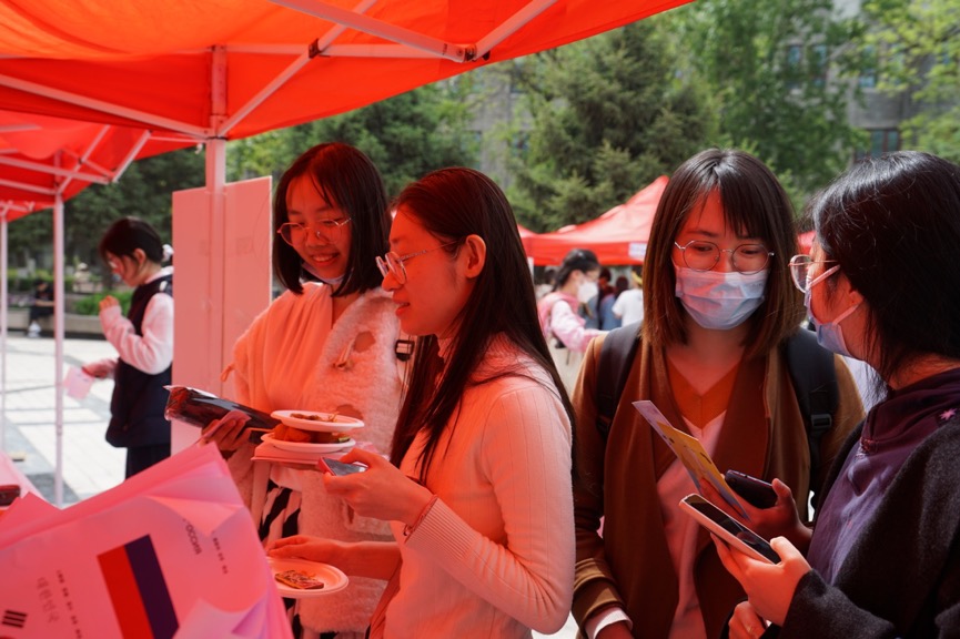 美食摊位涵盖了世界各地区的特色美食:俄罗斯的面包圈、越南黄龙绿豆糕、阿拉伯红枣夹心饼干,从北向南、从东向西,各类美食应有尽有,可谓是大饱口福,大家通过说出相应国家的语言或学习一句外语来获得品尝机会,摊位欢声笑语不断。