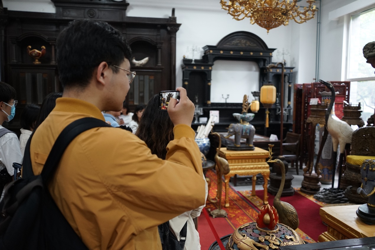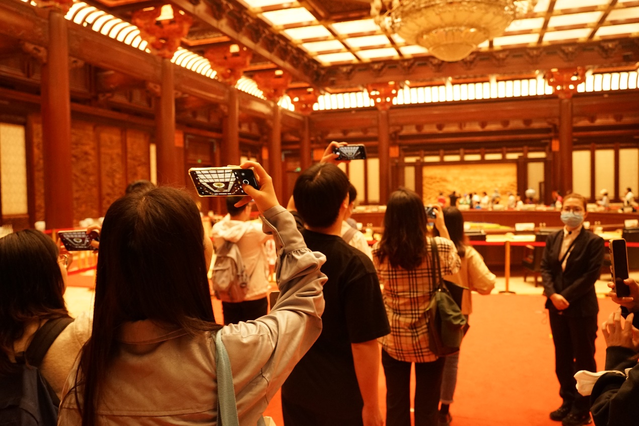 随后,实践团赴“会都”——北京雁栖湖国际会展中心参观。雁栖湖国际会议中心曾承办2014年APEC峰会以及首届与第二届“一带一路”国际合作高峰论坛圆桌峰会。师生一行跟随讲解员参观集贤厅,聆听讲解员讲解集贤厅室内设计的点滴思考与幕后故事,通过室内装潢与陈设,亲身感受峰会盛况。置身集贤厅内,汉唐气象与明清气派并举,古色古香与现代风格交融,融通古今,博雅东西,共同构成我国外交接待空间与国家礼仪空间的新地标,迸发出现代中国的文化自信与壮阔气势。建筑之美彰显人文之美,实践团师生在通过视觉、听觉近距离感受中国传统建筑的文化底蕴与艺术魅力的同时,也愈发坚定行语言专业所长、做文化交流使者的决心。国际盛事与大国外交呼唤扎根本土、放眼世界的复合型语言人才,开云官方网页版师生大有可为也必将大有作为。