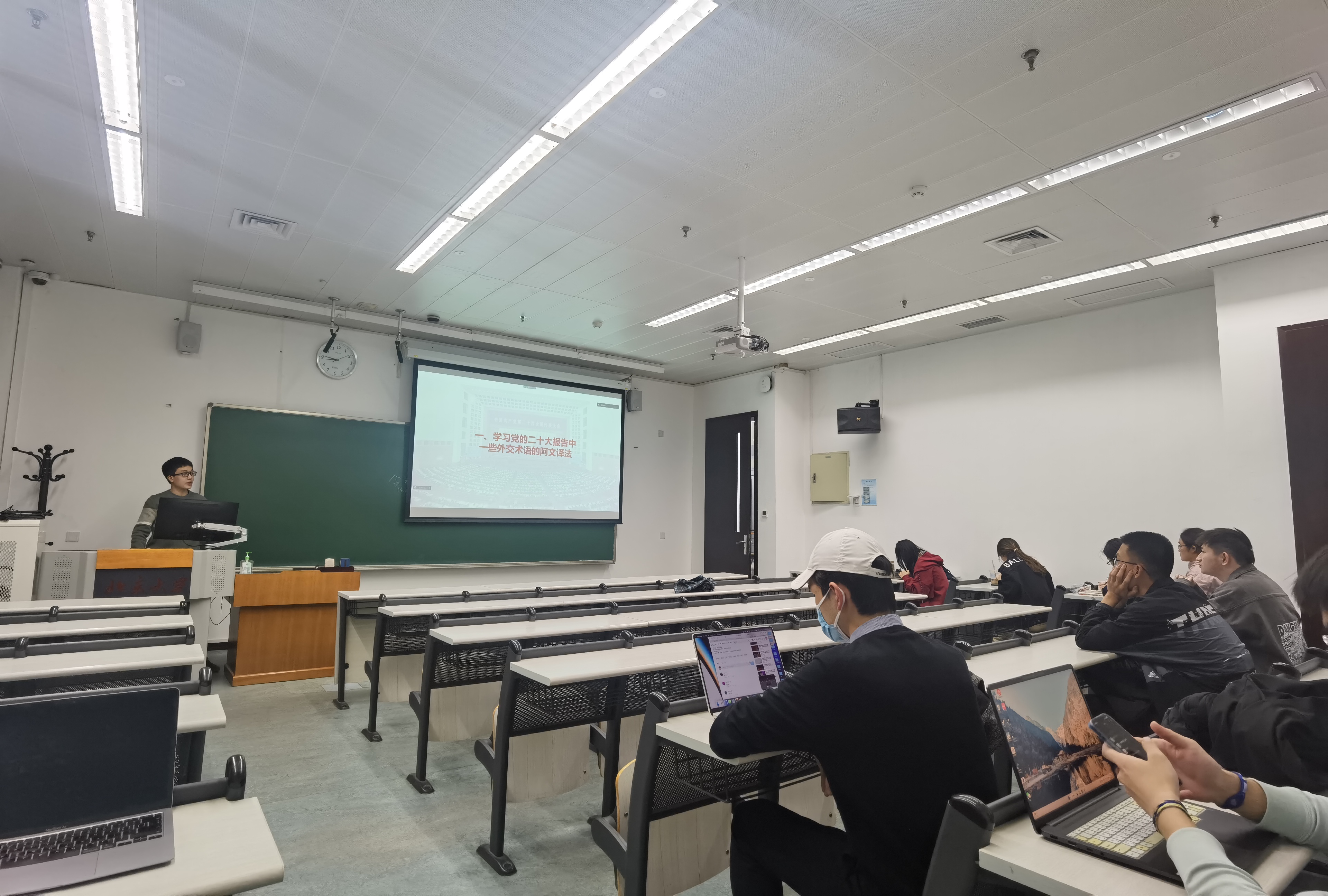 4月21日、5月26日,2019级本科生、领读者刘启铖分别带领阿拉伯语班本科生学习了党的二十大报告和习近平在首届中国-阿拉伯国家峰会开幕式上的主旨讲话。第一次读书会中,刘启铖简要介绍了二十大报告的内容和精神,讲解了二十大报告中外交术语和重点表达的阿拉伯语译法,帮助同学们了解中阿合作最新进展,如埃及斋月十日城铁路项目、中国斡旋促成沙特、伊朗和解等。第二次读书会上,刘启铖介绍了中阿峰会概况,带领大家观看了中阿峰会新闻报道视频,并学习了习主席主旨讲话内容及对应的阿语表达,如:“弘扬中阿友好精神,携手构建面向新时代的中阿命运共同体”等。通过以上学习,同学们感悟到了中国外交的成就与生命力,增强了学习外语的动力和信心。