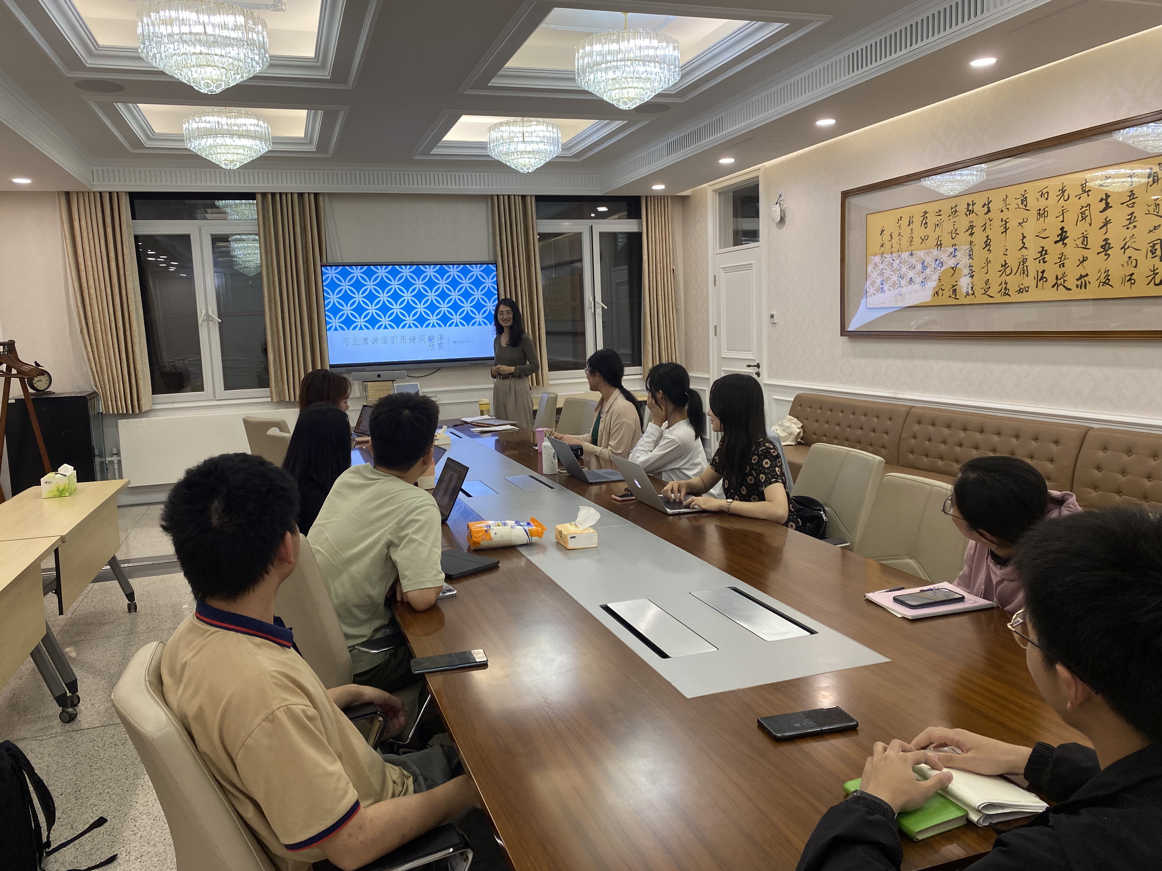 5月13日的法语班读书会主题为“浅谈政治文献翻译的准确性”。会议在同学们的交流互动中开始,随后介绍了二十大中文及法语文本,列举了翻译中常见的错误,最后结合外文出版社法文专家的讲座指导,以例证结合的方式向同学们讲解准确翻译的重要性。2021级博士生、领读者赵婉雪讲解了翻译重要文件中的专有名词时容易出现的错误,和中国传统文化相关词汇的翻译,并传授了能准确表达中国理念的翻译方式。在5月21日的读书会上,2022级博士生、领读者孟瑶带领同学们学习了《习近平谈治国理政》(第三卷)中的多篇讲话,主要包括习近平主席引用的古诗词段落的法文翻译、所选段落中的时政热词,并探讨了古诗词翻译的技法策略。通过学习,同学们对我国科技、文化、生态文明、制度建设的重要理念更加了解,在通过古诗词翻译感受到中文和法语的语法美感的同时,增强了文化自信。
