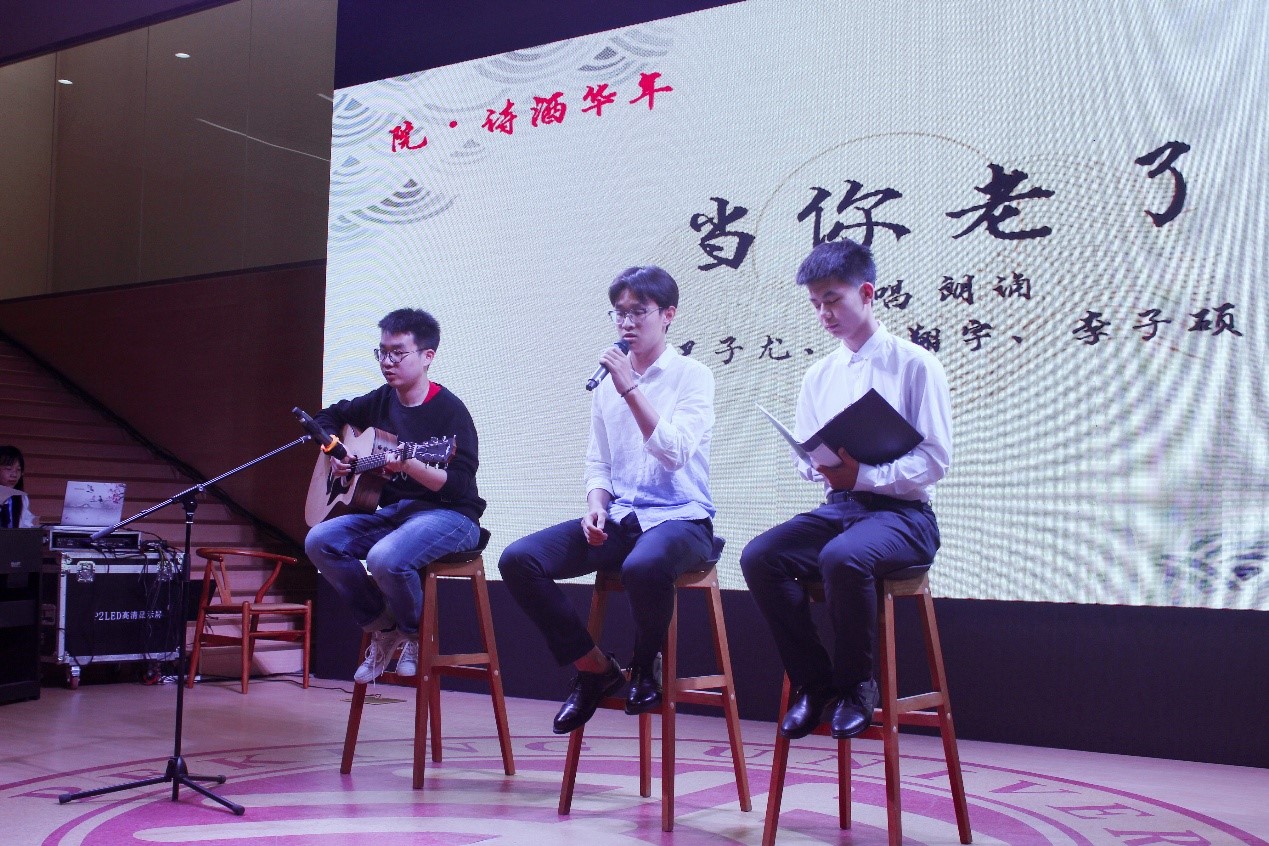 “院·诗酒华年”板块,张甲民老师和张江龙同学诵读《再见吧,北京》,缅怀已故诗人对北京、对燕园的一腔赤诚;弹唱朗诵《当你老了》向前辈致敬,感谢老一辈外院人将青春与汗水播撒在这一方土壤,浇灌出外文楼前的繁花似锦,也浇灌出北大外院的桃李芬芳。