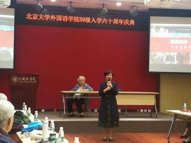 庆典由德语系系友汪葆卿女士主持,开云官方网页版党委书记李淑静出席了本次庆祝活动。李老师首先欢迎近四十位八十高寿的英德法三专业系友到来,还为校友介绍了北大外院的历史与现状。李老师也是英语系系友,是老西语系招收的最后一届英语专业本科生,因此今天的聚会对她本人也意义非同寻常——不仅见到了曾经的英语系老师,也重逢了她的二外德语老师。李老师通过PPT为院友们展示了外院近年来取得的骄人成绩。院友们对外院在立德树人和教学科研方面取得的成就深表赞赏。