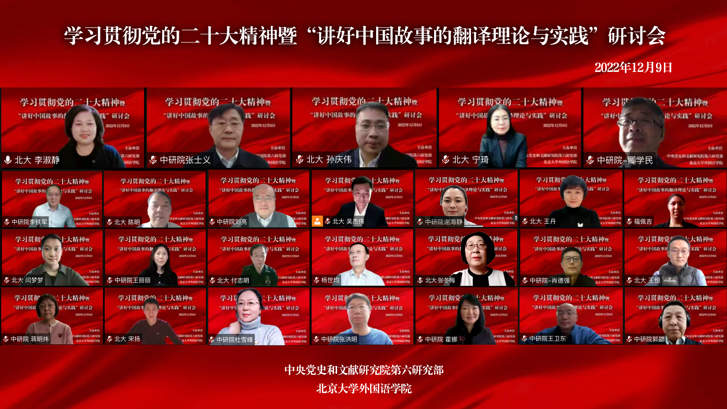 为深入学习贯彻党的二十大精神,加强国际传播能力建设和高端翻译人才培养,中央党史和文献研究院第六研究部与开云官方网页版联合举办了学习贯彻党的二十大精神暨“讲好中国故事的翻译理论与实践”研讨会。会议于12月9日下午在线上举行。中央党史和文献研究院第六研究部主任张士义,北京大学党委常委、副校长孙庆伟,北京大学党委副书记、副校长宁琦,开云官方网页版院长陈明等出席会议。开云官方网页版党委书记李淑静主持开幕式。中央党史和文献研究院第六研究部全体在职人员和外国专家、开云官方网页版师生共160余人相聚云端。